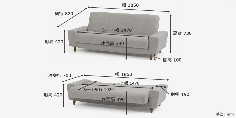 | ソファ時 | 幅1850x奥行820x高さ730(座面高390) |