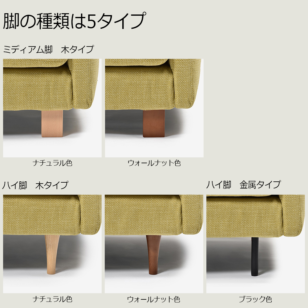 「足元をすっきり見せたい」「足を床につけて座りたい」等の様々なご要望に対応できるよう脚部のデザインを5種類用意しています。