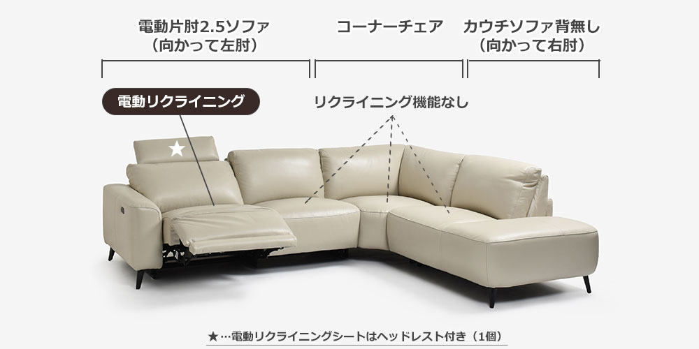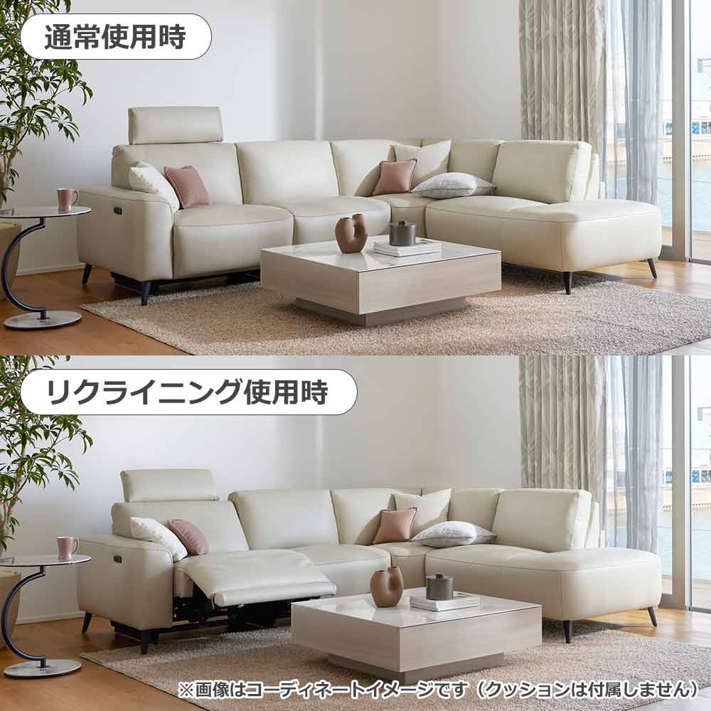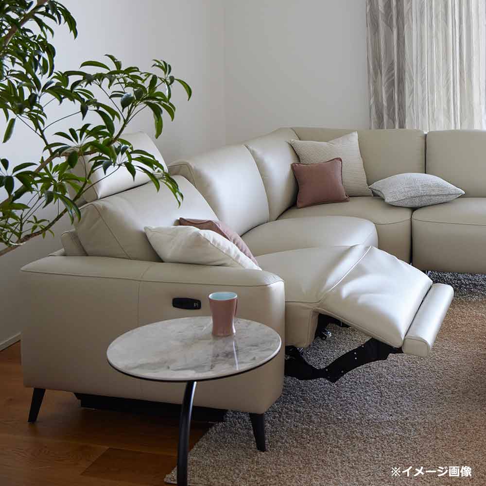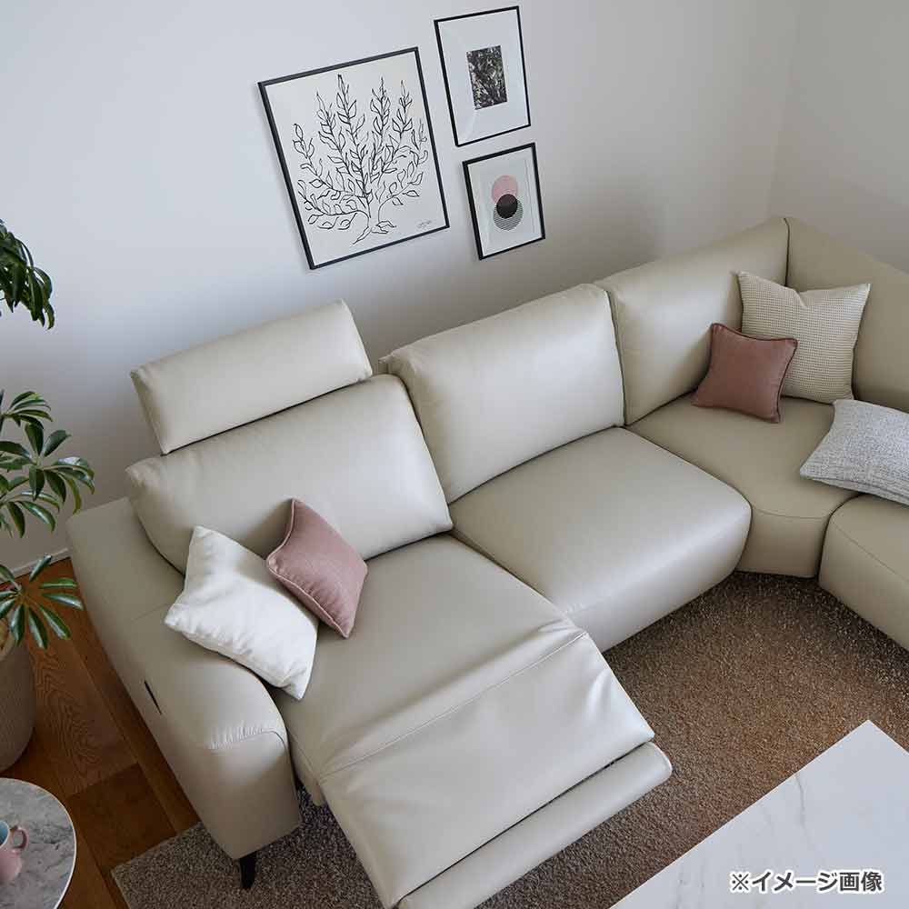 向かって一番左側のシートに、背面と座面が同時に動く1モータータイプの電動リクライニング機能がついています。リクライニング機能付きのシートにはヘッドレストが付いており、頭から足までゆったりと身体を預けてくつろぐことができます。コーナーチェアに座り、カウチ部分に脚をのせてくつろぐことも可能な組合わせです。