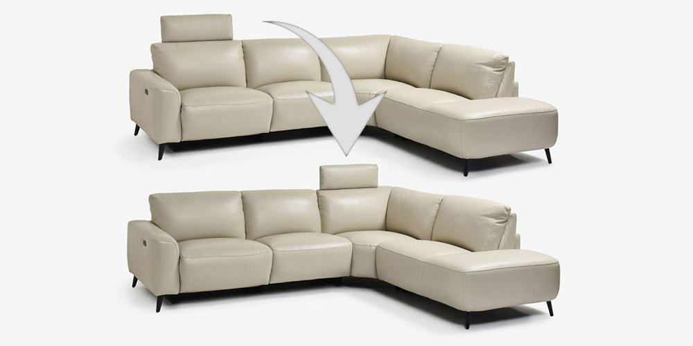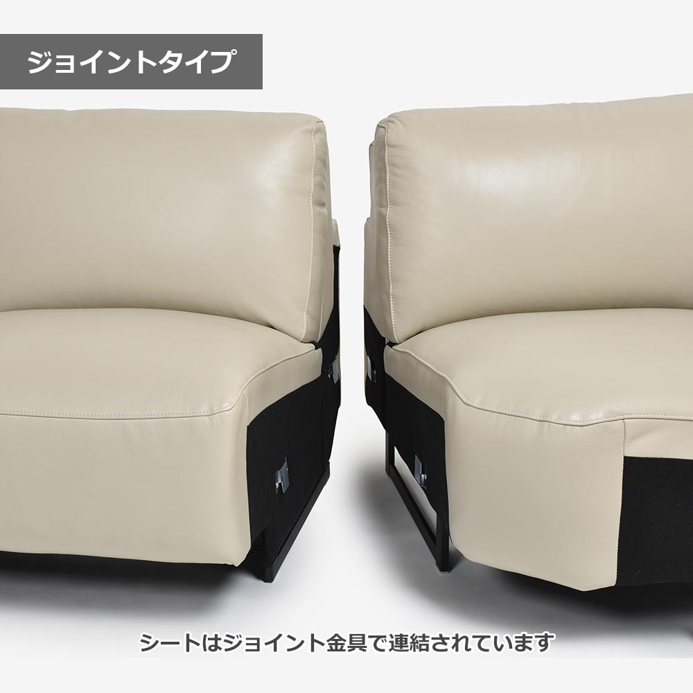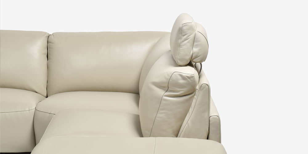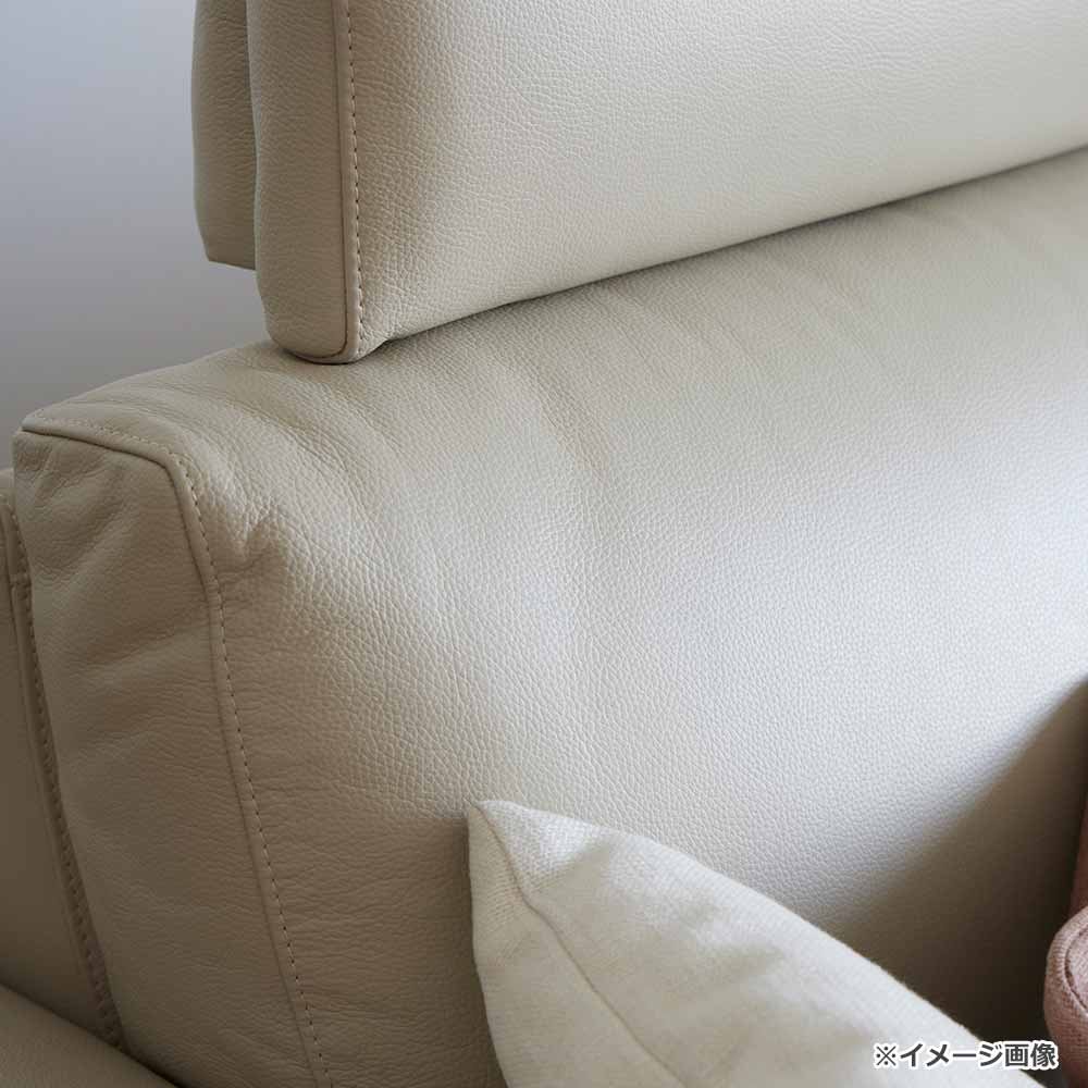 向かって一番左側のシートに、背面と座面が同時に動く1モータータイプの電動リクライニング機能がついています。リクライニング機能付きのシートにはヘッドレストが付いており、頭から足までゆったりと身体を預けてくつろぐことができます。コーナーチェアに座り、カウチ部分に脚をのせてくつろぐことも可能な組合わせです。