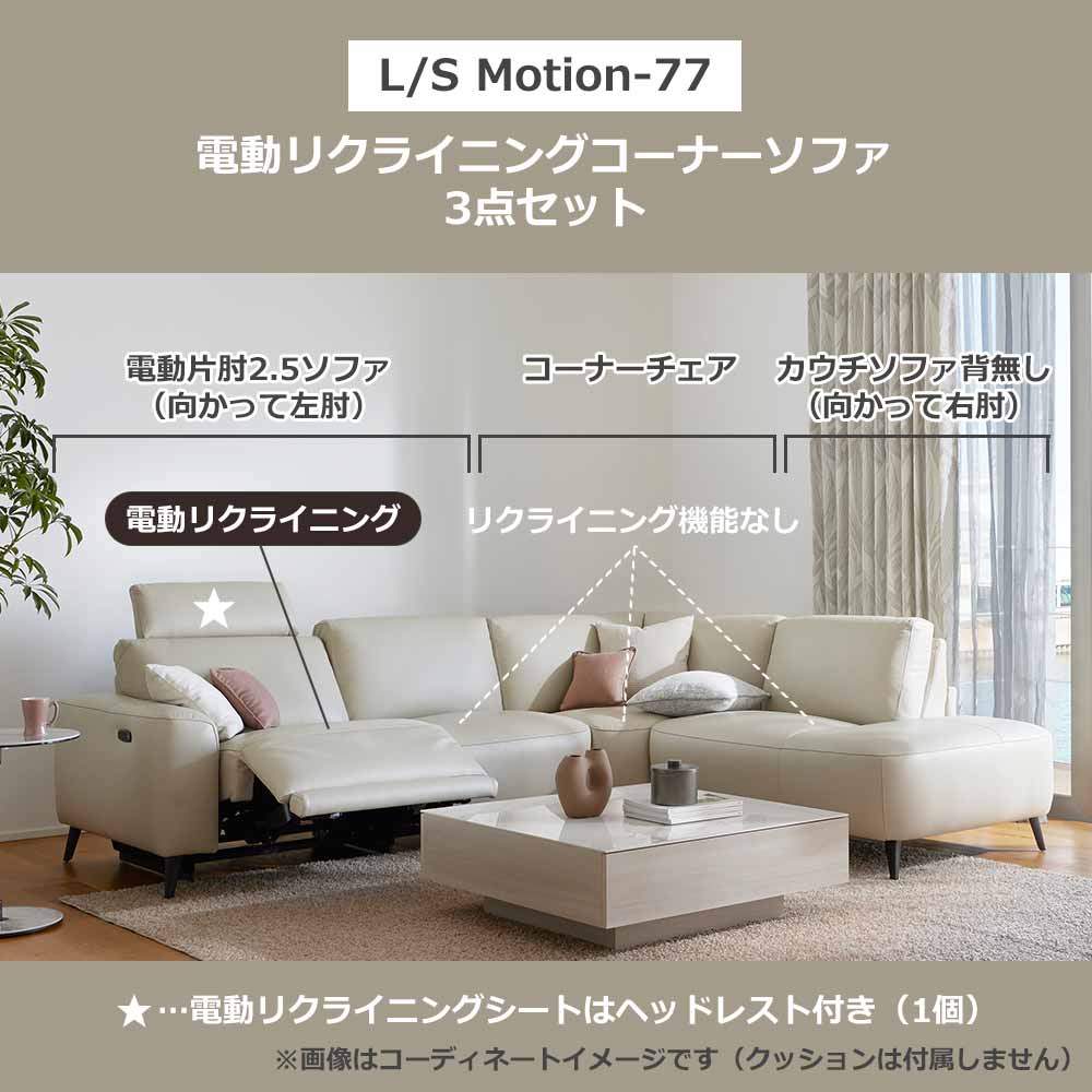 電動リクライニングコーナーソファ3点セット 向かって右カウチ「L/S Motion 77(エルエスモーション77)」幅275cm 革#J/S-041E オイスターグレー色
