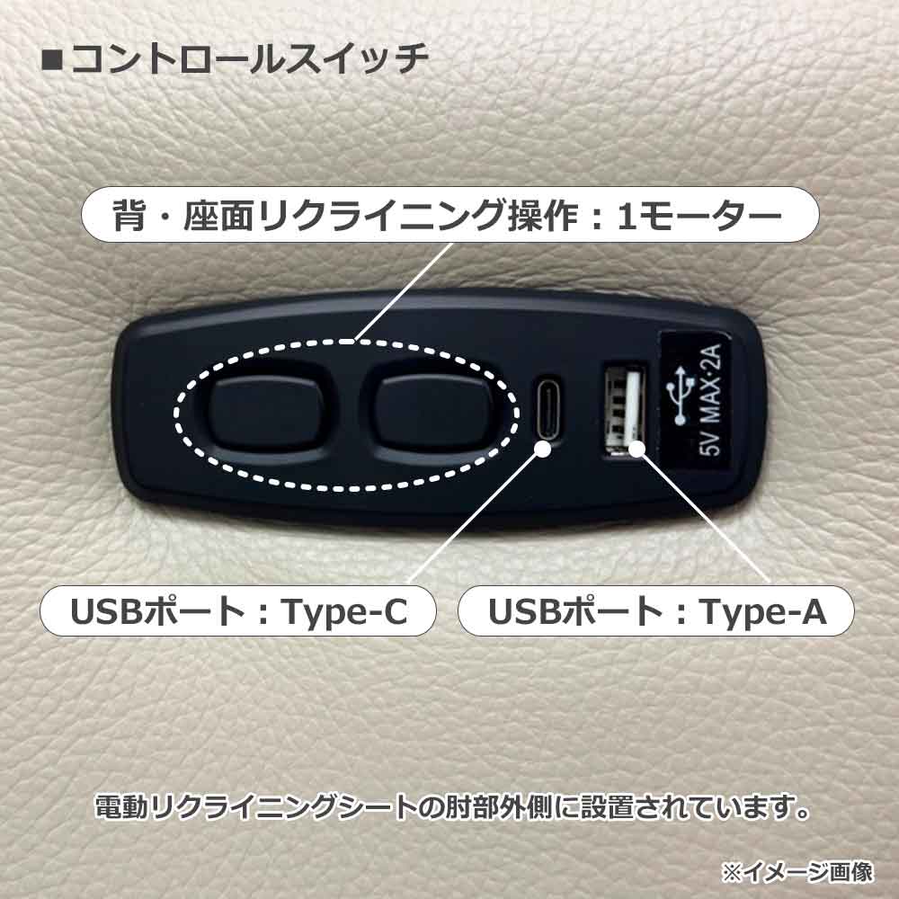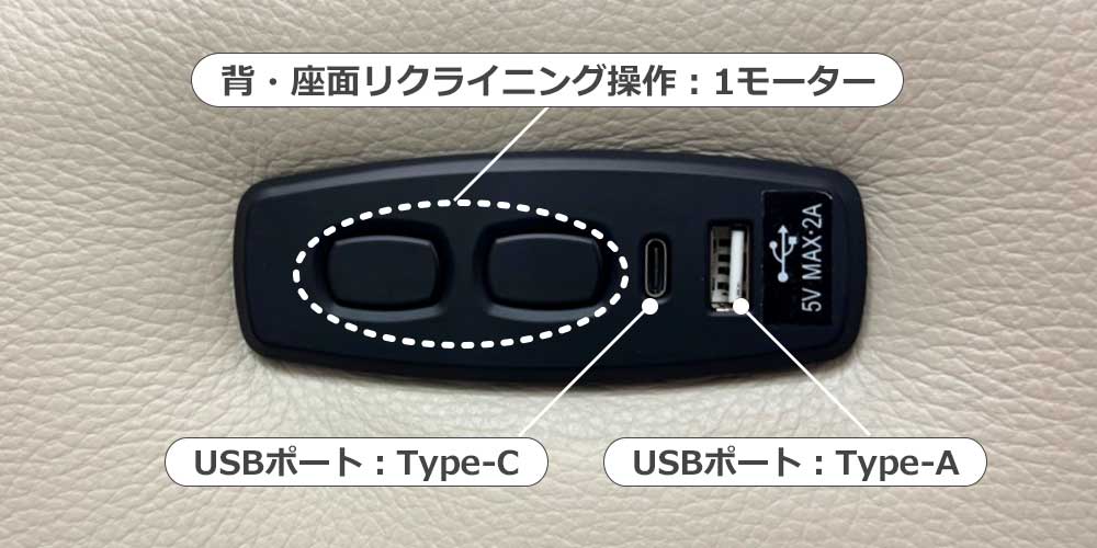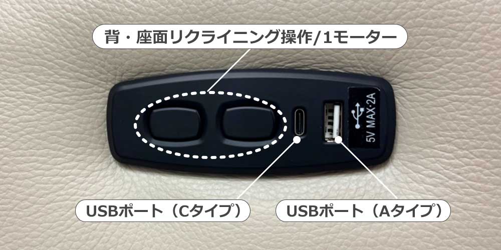 簡単なボタン操作で背・座面のリクライニング角度調整ができます。便利な2タイプ(Type-A、Type-C)のUSBポートもついており、ソファでくつろぎながらスマートフォンやタブレットなどの充電も可能です。