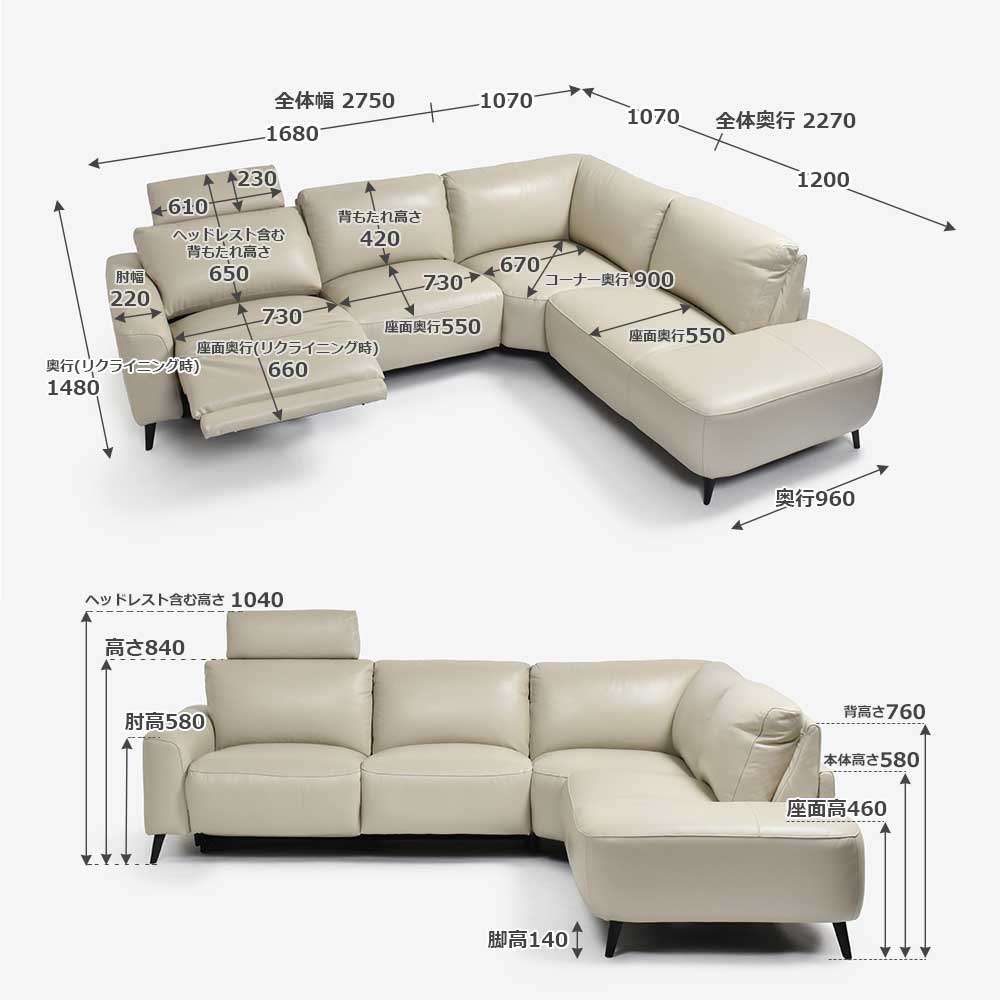 | 電動片肘2.5ソファ(向かって左肘) | 幅1680x奥行960〜1480x高さ840〜1040 |