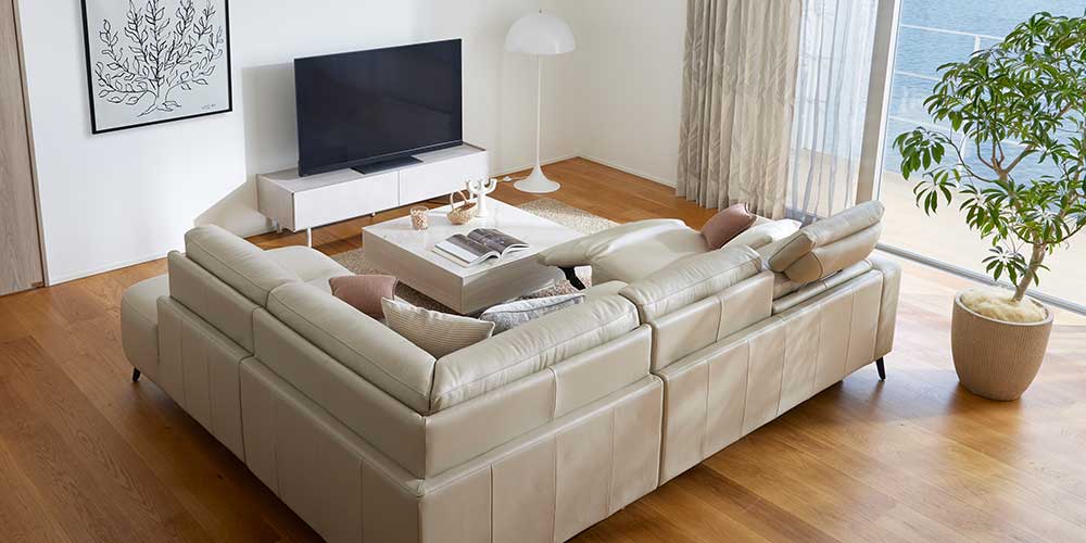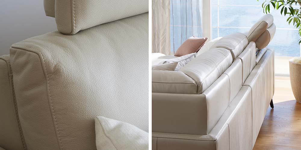 厳選された革本来の柔らかさが活きた肌触りのよいレザーを使用しています。背面までこだわり抜いた美しい仕上げで、壁付けのレイアウトはもちろん、お部屋の中央に置いても圧迫感なくスタイリッシュな空間を演出します。