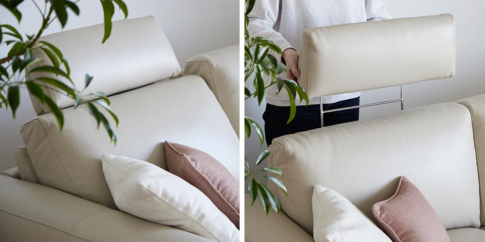 電動リクライニングシート部分に付属のヘッドレストは、手動で角度の調整も可能。テレビを見る、本を読む、お昼寝をするなどシーンに合わせてちょうどよい角度に調整することで、快適にお過ごしいただけます。