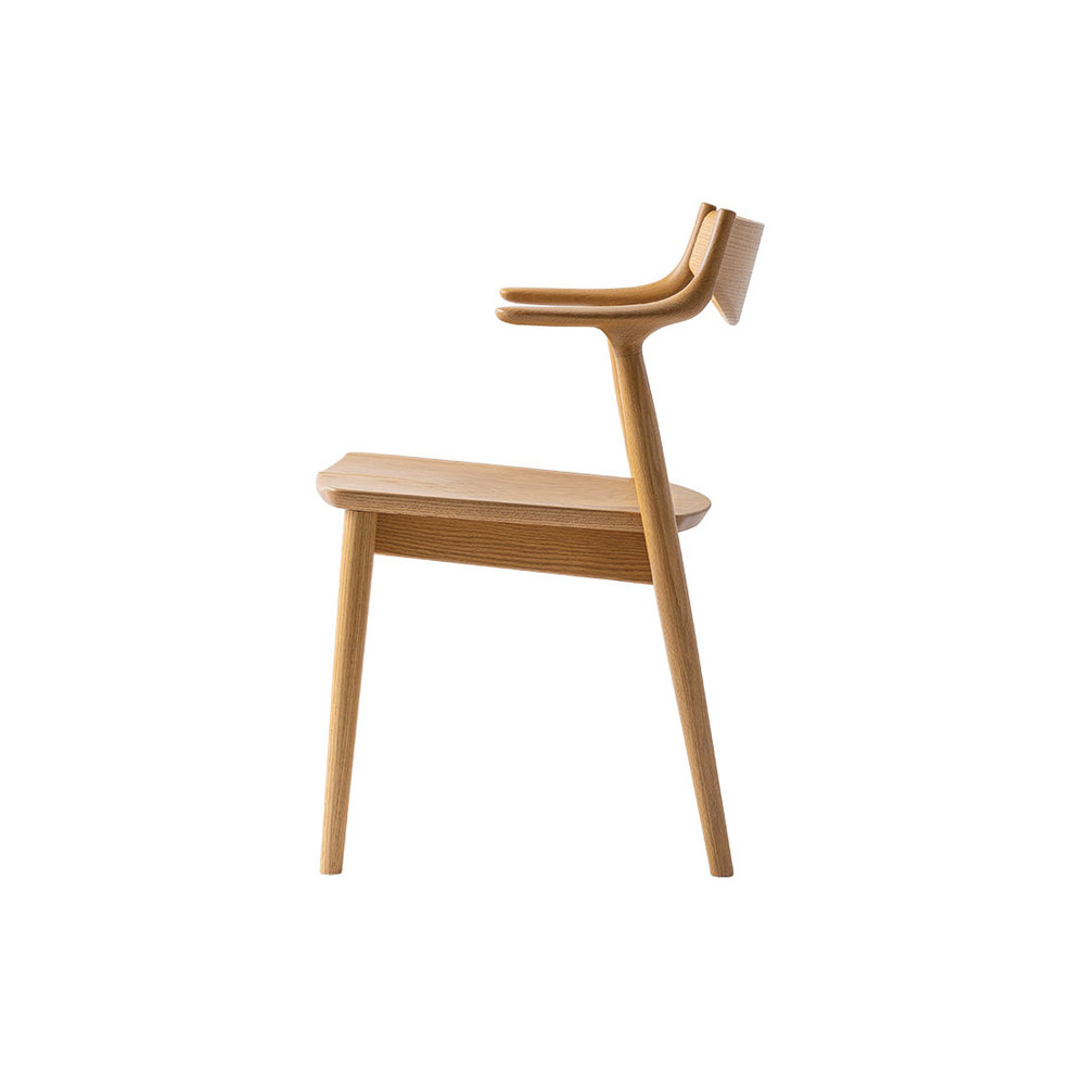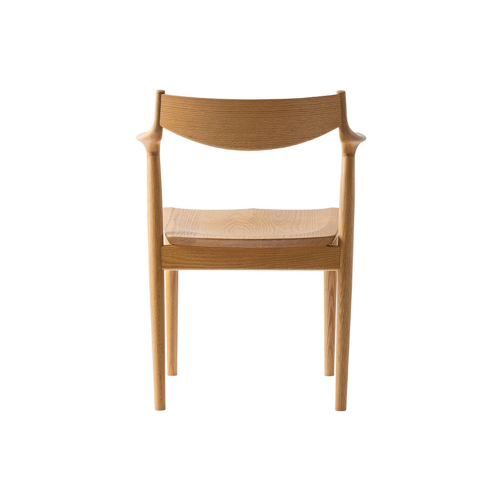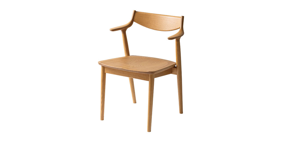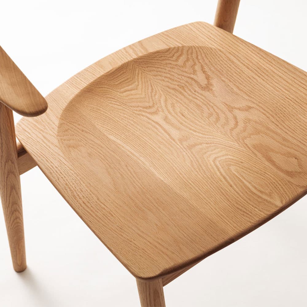 曲木加工を施した背板、複雑な曲面の形成からなる有機的な肘形状など、浜本工芸の職人の高い技術を活かしたクラフトマンシップを感じるダイニングシリーズです。背は一枚板に曲木加工を施しており、背当たりのよい曲線が魅力です。座面の凹凸がフィットし、快適な座り心地の板座タイプです。