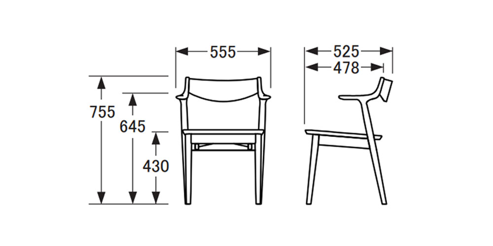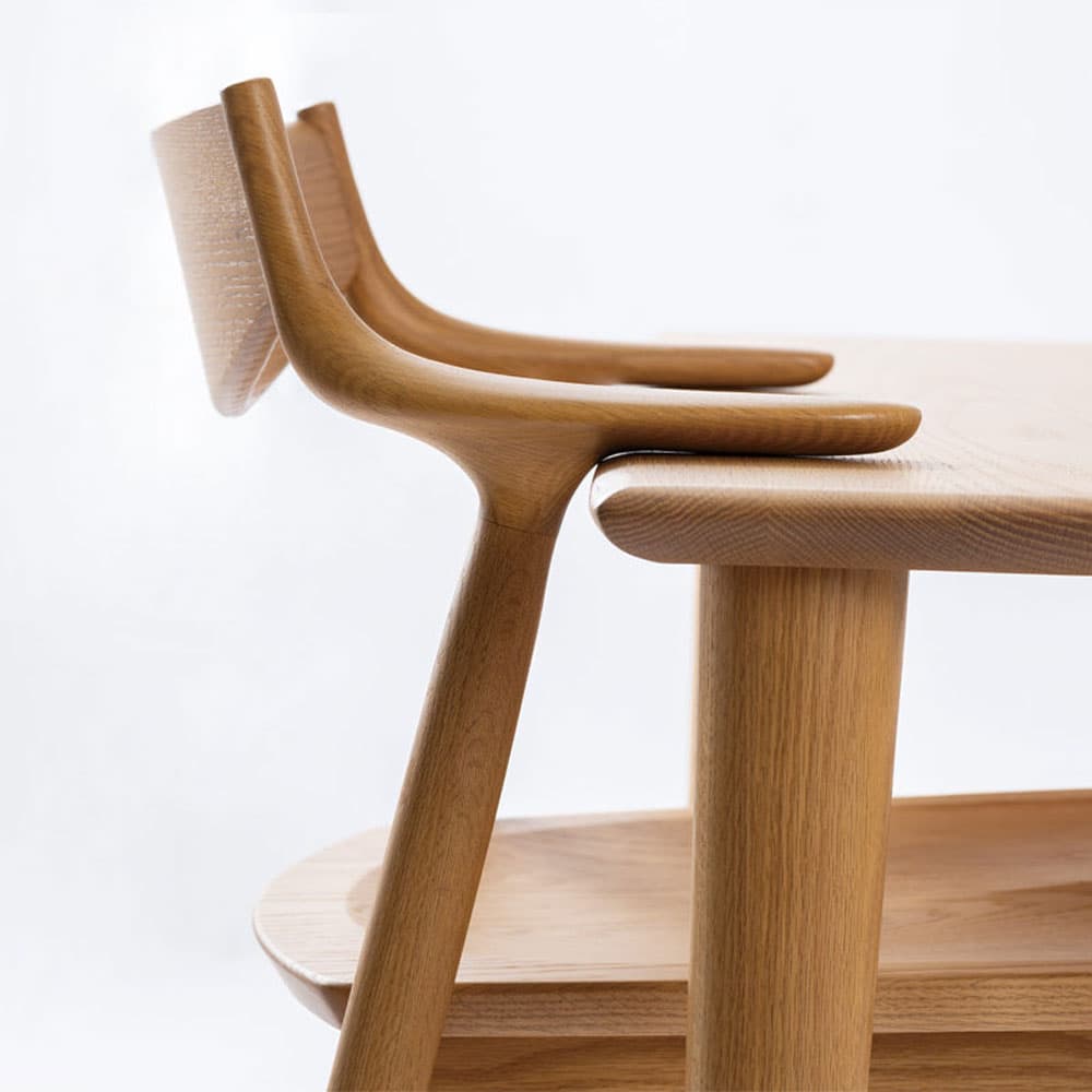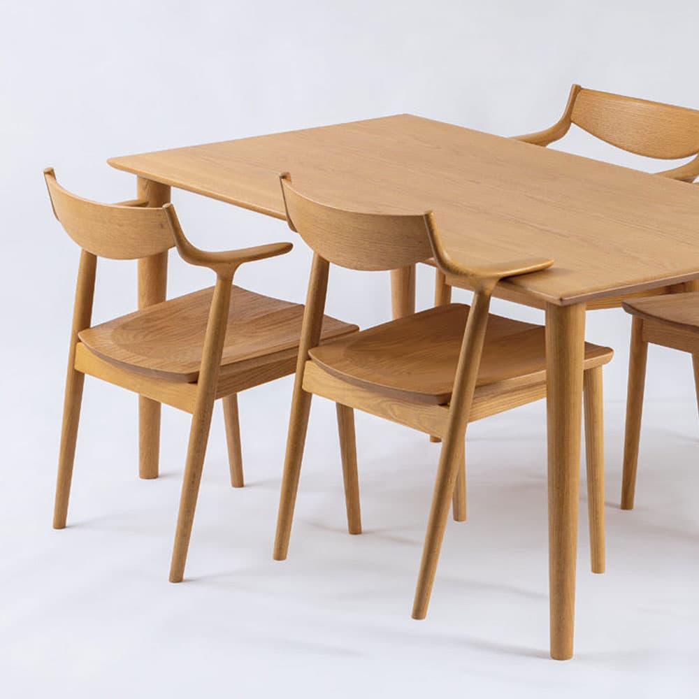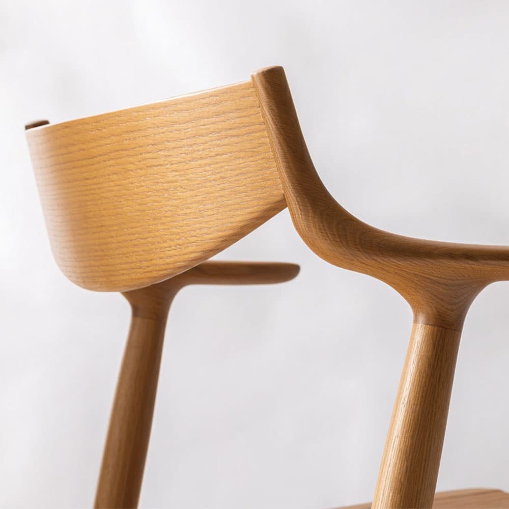 曲木加工を施した背板、複雑な曲面の形成からなる有機的な肘形状など、浜本工芸の職人の高い技術を活かしたクラフトマンシップを感じるダイニングシリーズです。背は一枚板に曲木加工を施しており、背当たりのよい曲線が魅力です。座面の凹凸がフィットし、快適な座り心地の板座タイプです。