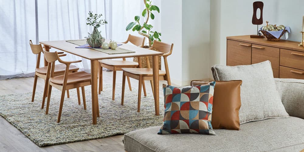 温かみのあるオーク材ナチュラル色が優しい印象のダイニング空間を演出します。