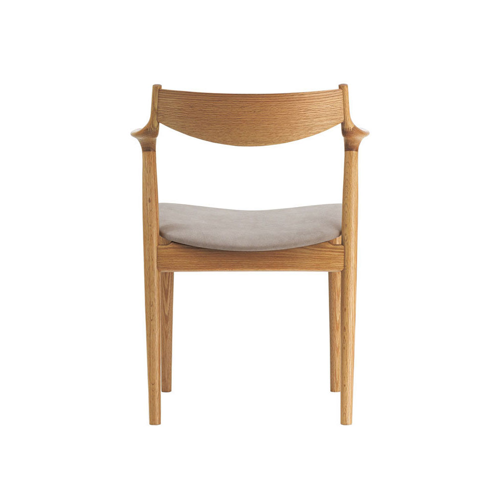 曲木加工を施した背板、複雑な曲面の形成からなる有機的な肘形状など、浜本工芸の職人の高い技術を活かしたクラフトマンシップを感じるダイニングシリーズです。背は一枚板に曲木加工を施しており、背当たりのよい曲線が魅力です。