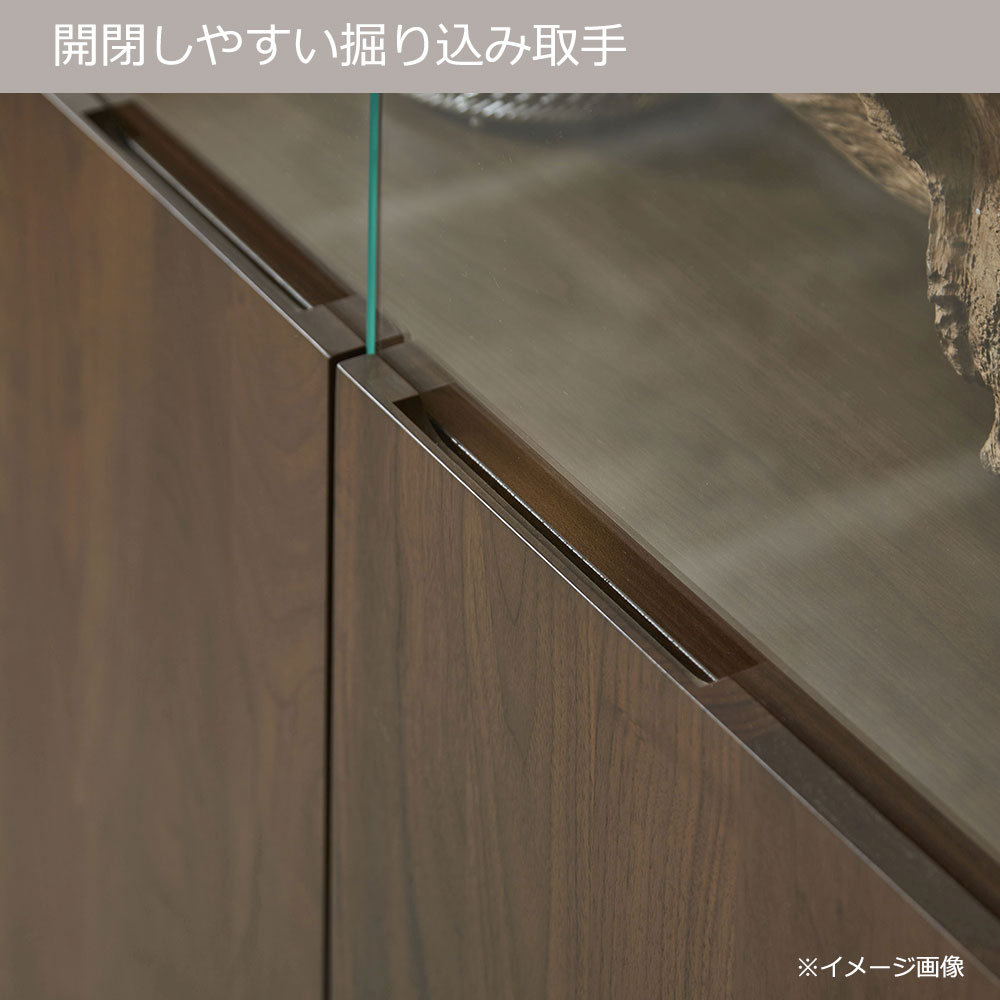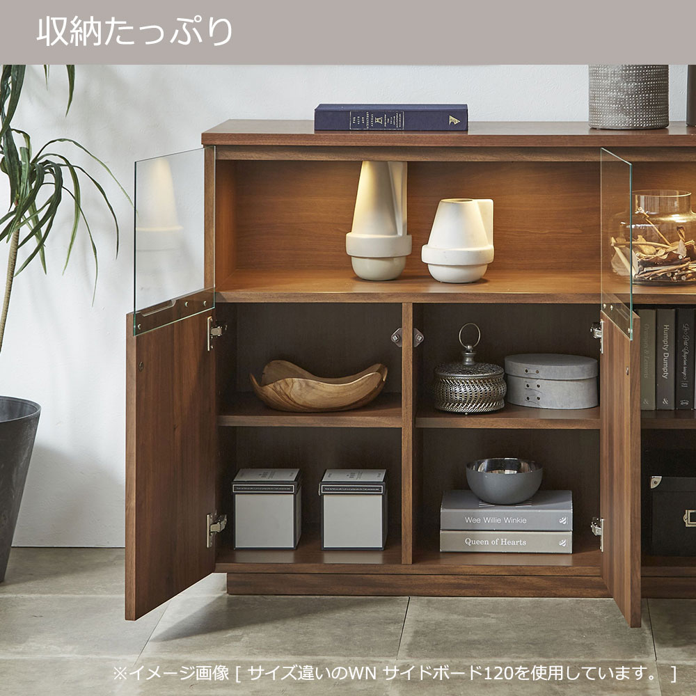 LED照明付きのガラス面があり、隠す収納と飾る収納を両立したサイドボードです。※画像はWNウォールナット材のイメージです。小物類は付属いたしません。