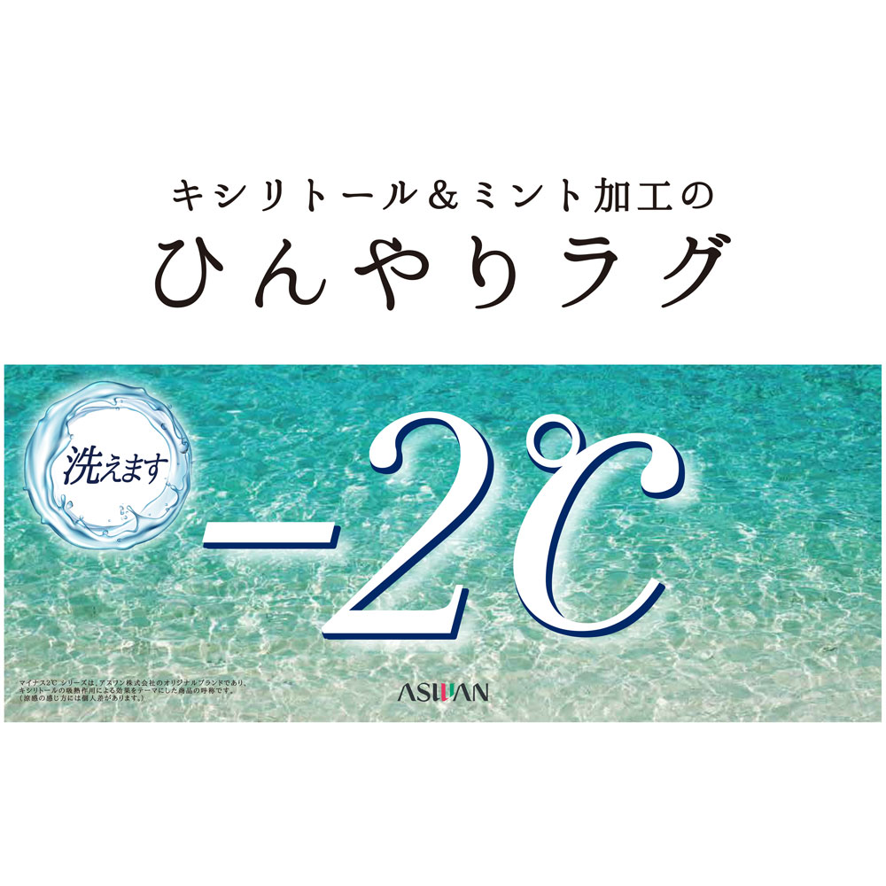 「-2℃シリーズ」は、汗などの水分に反応して涼感効果をもたらす天然成分のキシリトールと、涼感効果を持続する働きがあるミントをラグの表面に加工してあります。触れるとひんやり心地よく暑い季節を快適に過ごすのにぴったりのラグです。