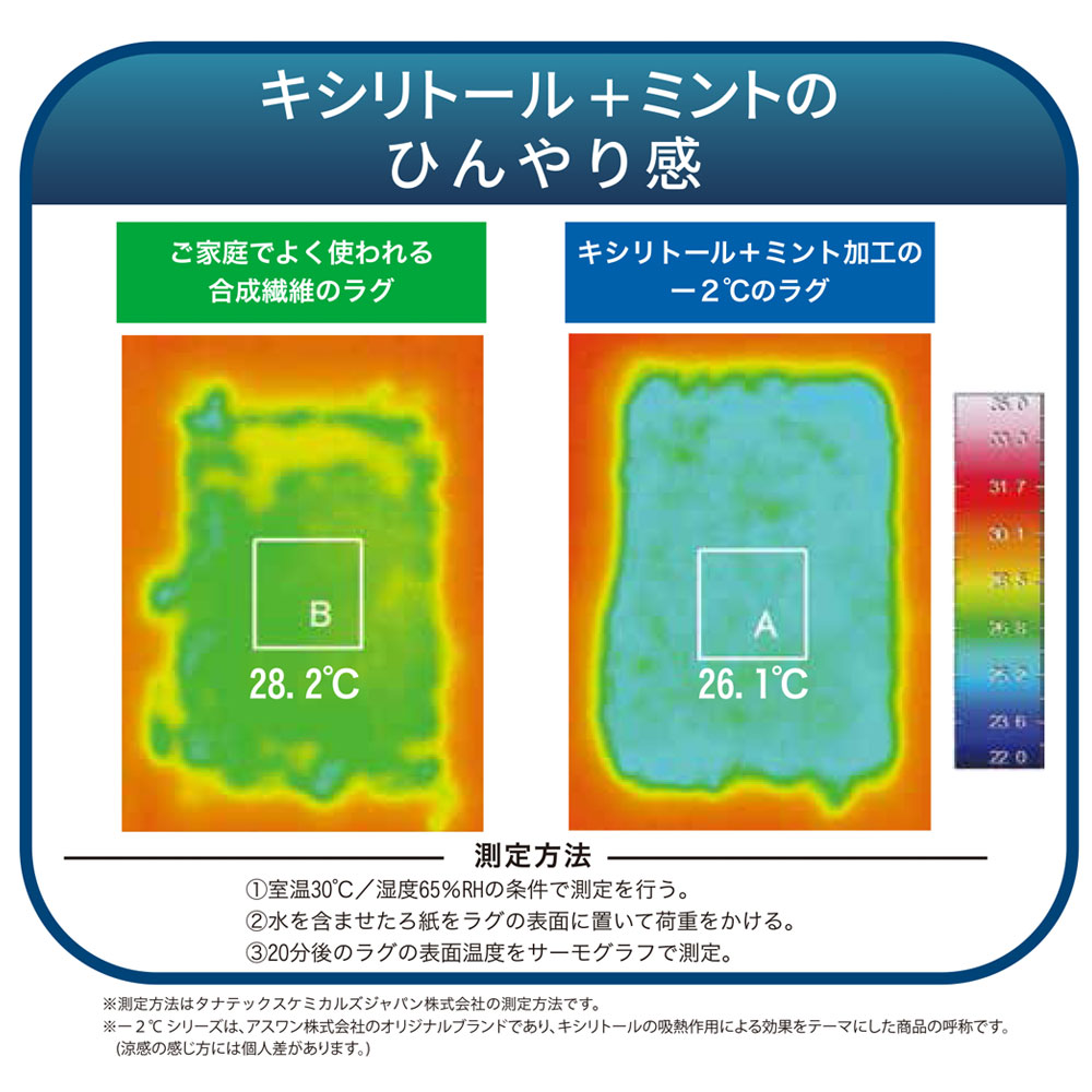 「-2℃シリーズ」は、汗などの水分に反応して涼感効果をもたらす天然成分のキシリトールと、涼感効果を持続する働きがあるミントをラグの表面に加工してあります。触れるとひんやり心地よく暑い季節を快適に過ごすのにぴったりのラグです。