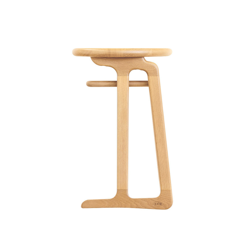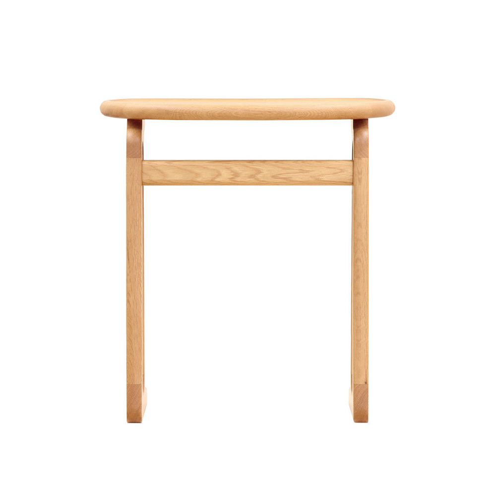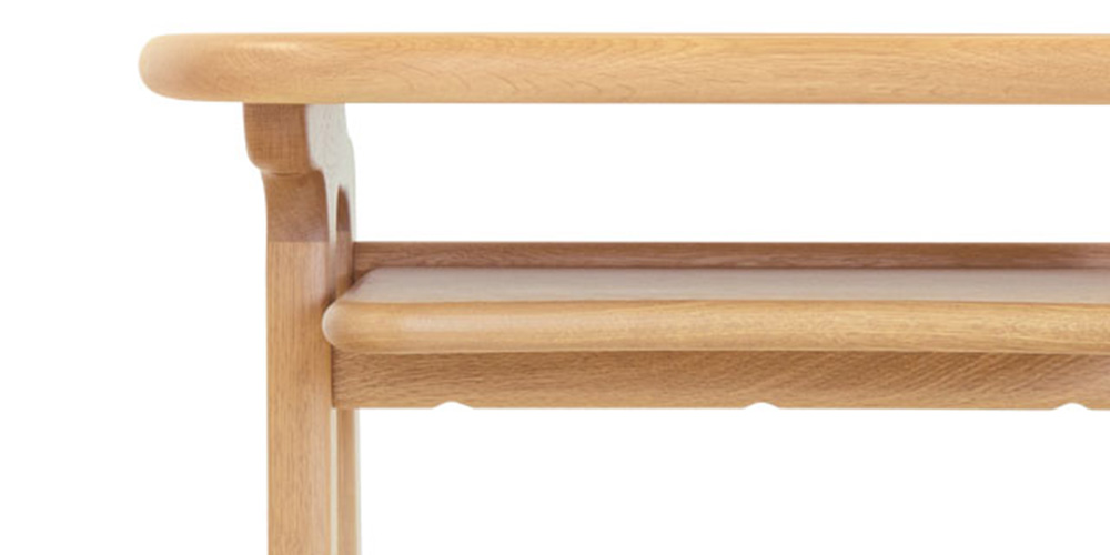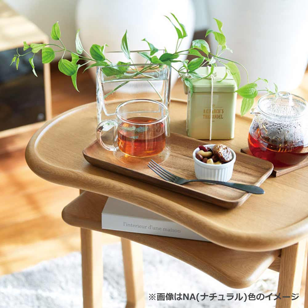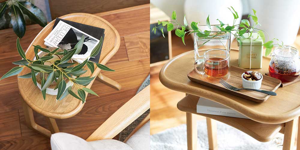 掘り込み加工を施した天板形状が特徴的なサイドテーブル。脚元は掃除がしやすく、ソファと合わせやすいように設計したこだわりの形です。天板にはオークの無垢材を使用し、天板の表裏両面には、キズ・汚れ・耐熱性に優れたUV塗装を施しています。