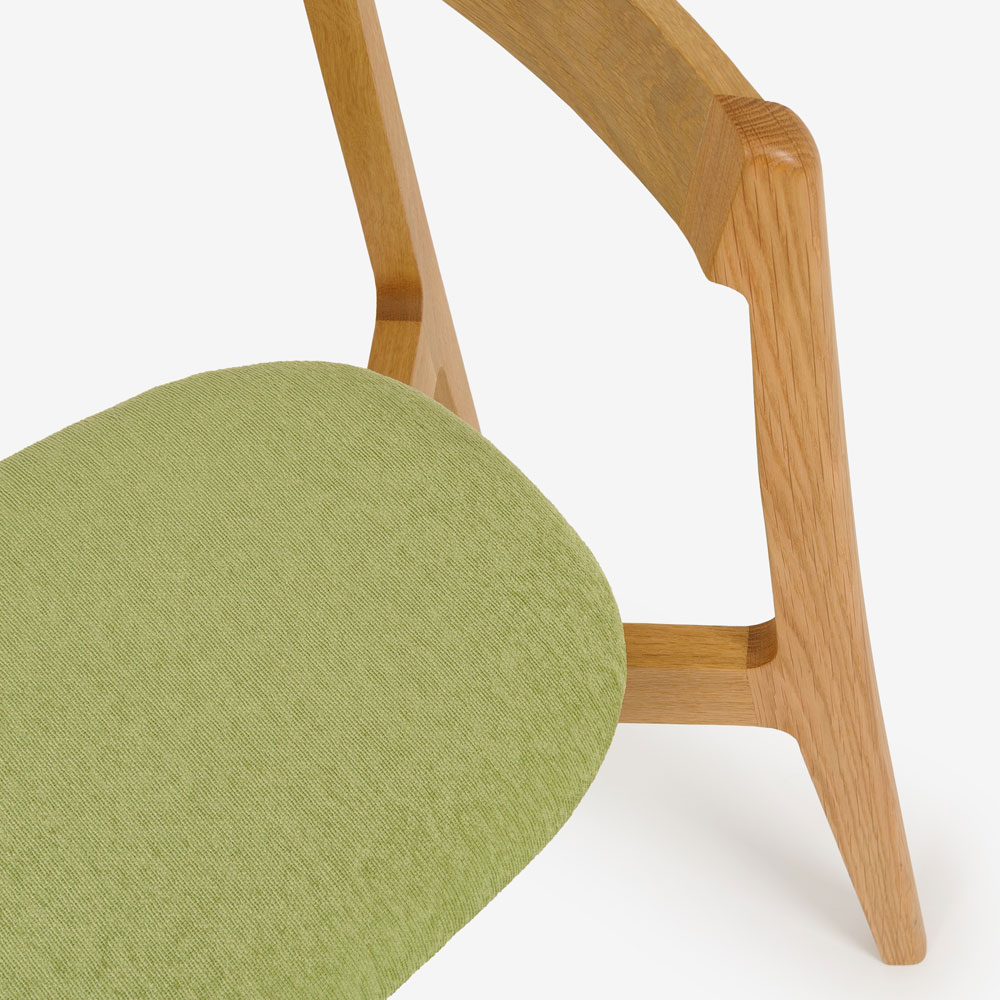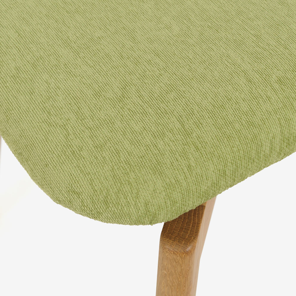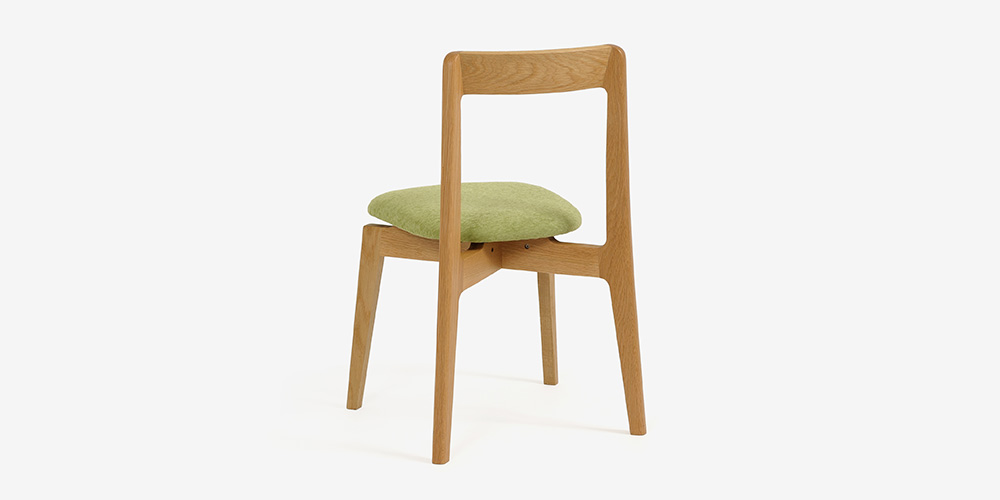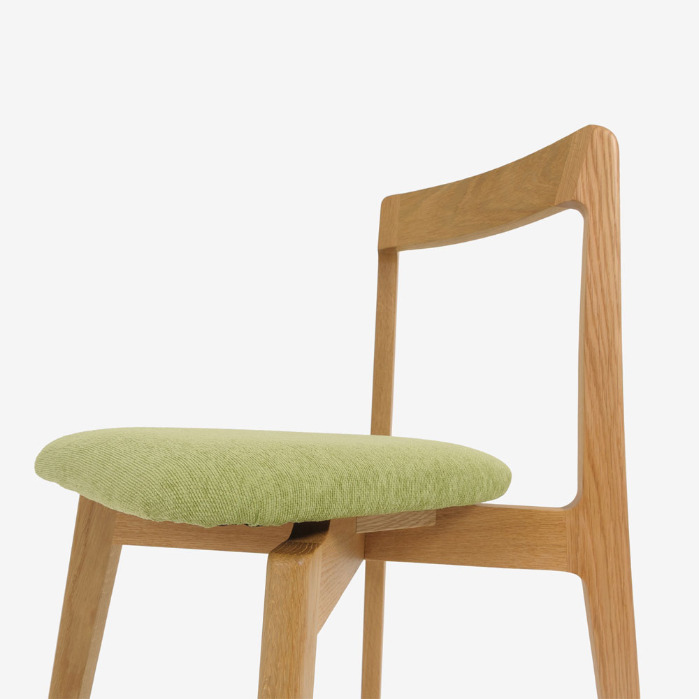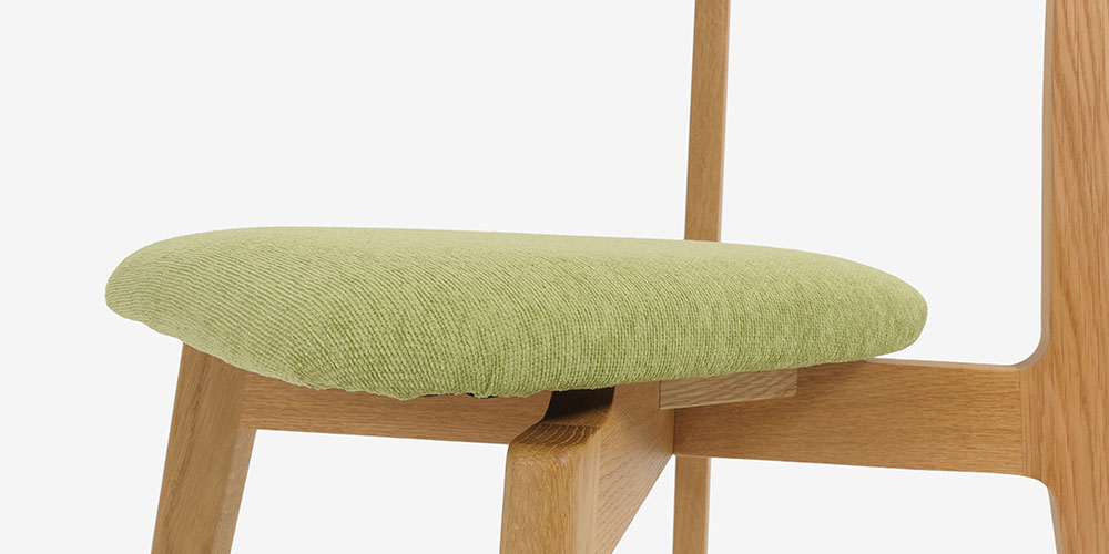 張地の布は表面に少し毛羽感のある優しい手触りです。ホワイトオーク材と座面張地の明るいイエローグリーンは相性よく、お部屋を明るくナチュラルな雰囲気にしてくれます。