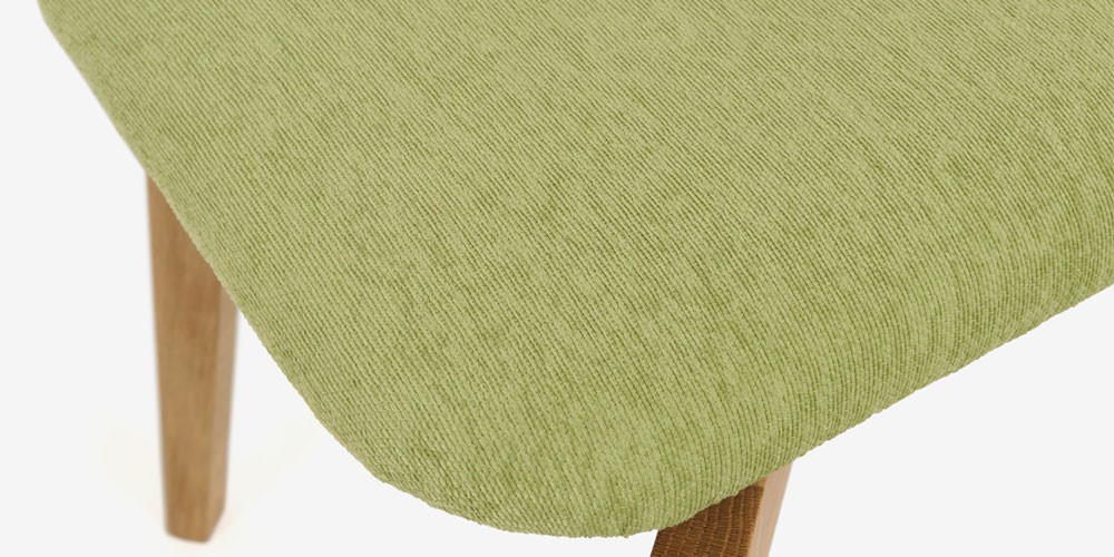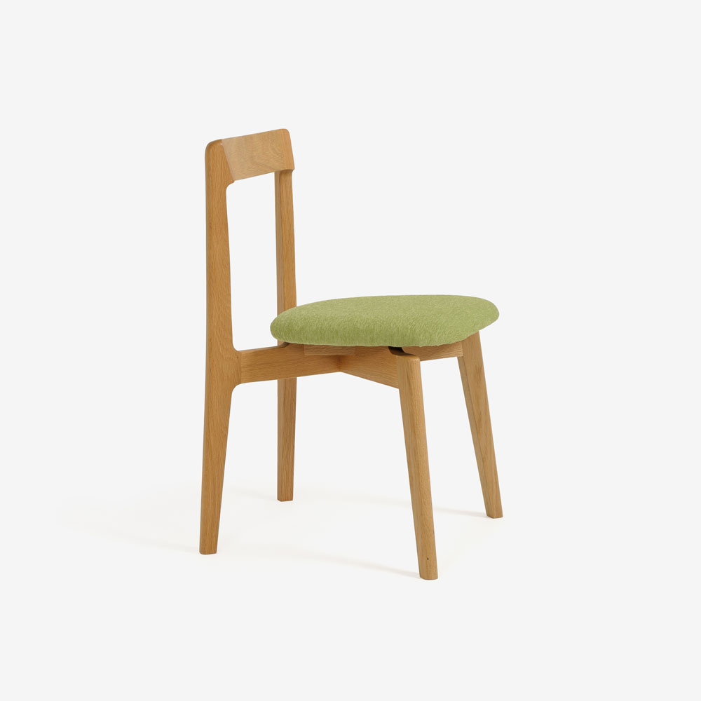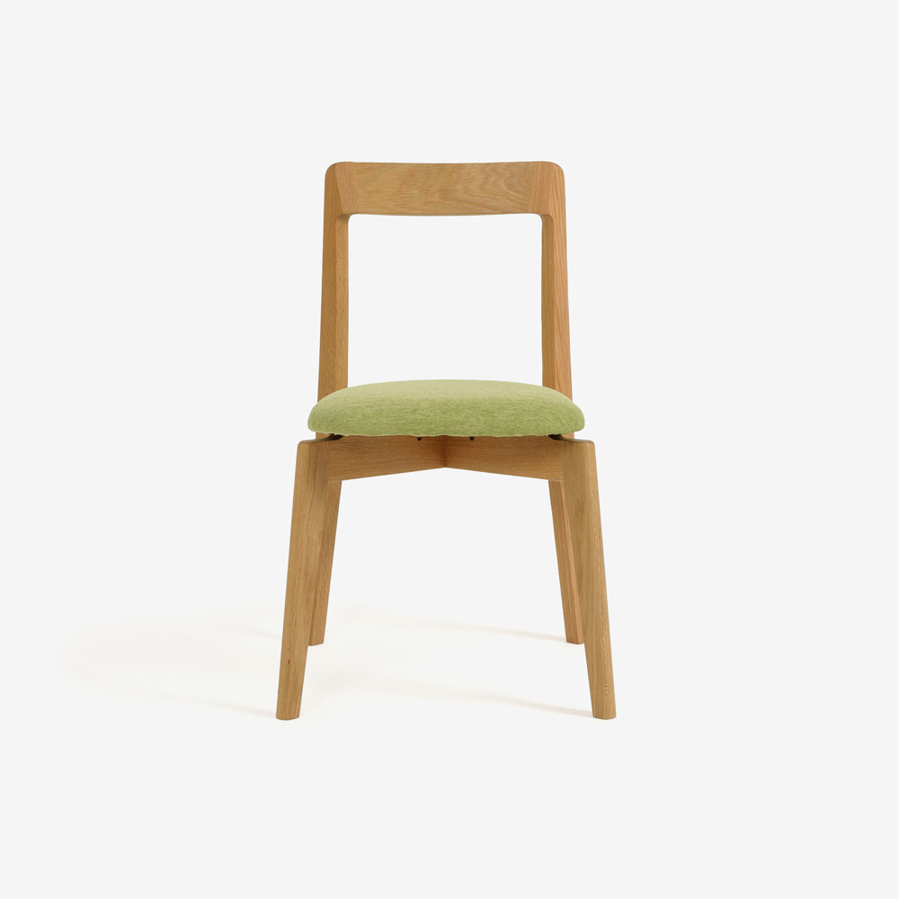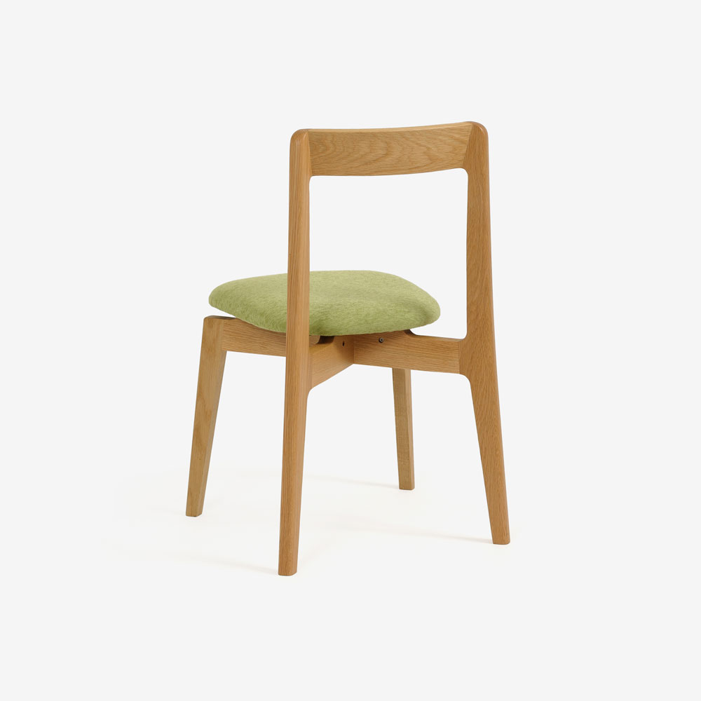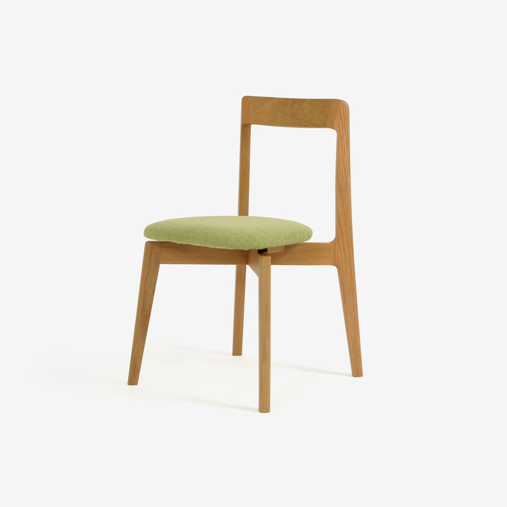 張地の布は表面に少し毛羽感のある優しい手触りです。ホワイトオーク材と座面張地の明るいイエローグリーンは相性よく、お部屋を明るくナチュラルな雰囲気にしてくれます。