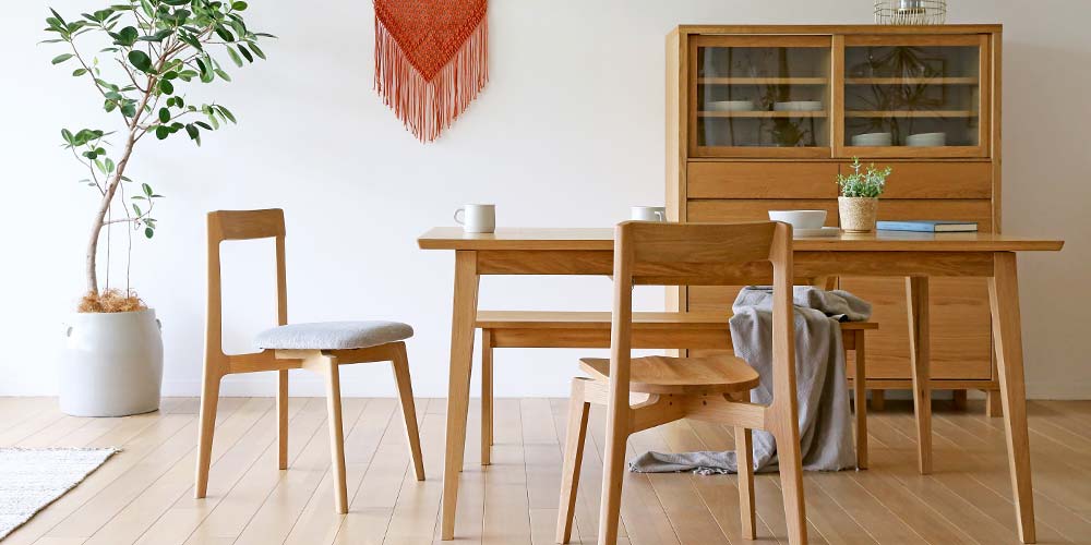 画像左の椅子が「リアルト 布座タイプ」、手前が「リアルト 板座タイプ」のコーディネートイメージです。