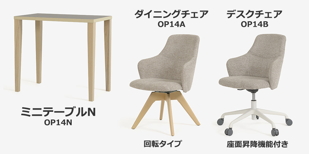 シリーズアイテムとして木脚の回転チェアと座面昇降機能付きデスクチェアがあり、使うシーンに合わせてお選びいただけます。
