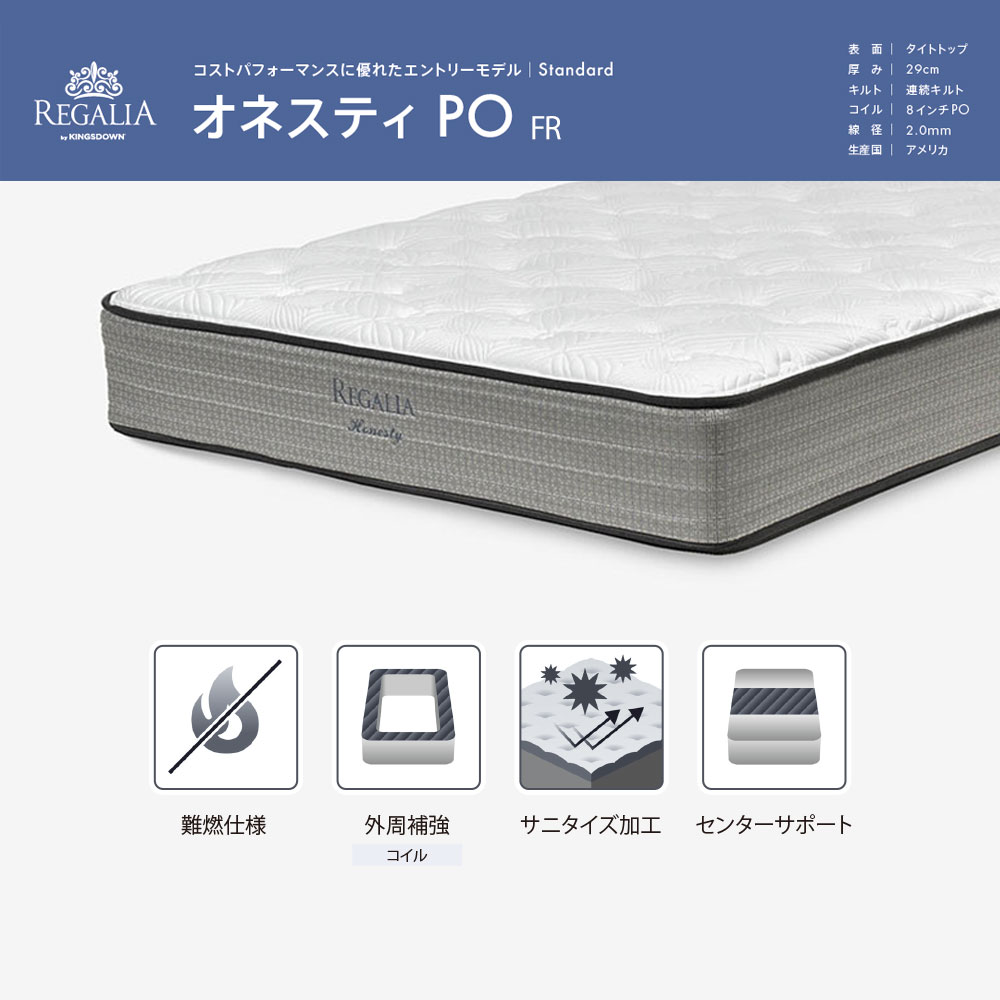 100年以上にわたり最高の眠りを追求してきた米国・キングスダウン社と共同開発した究極の眠りを約束するプレミアムマットレスブランド「レガリア」。「オネスティ POFR」は上位モデルと同仕様の贅沢な8インチのポケットコイルを採用。ストロークが長いポケットコイルは、身体の凹凸はもちろん横向き寝の大きなS字ラインにもしっかりフィットします。