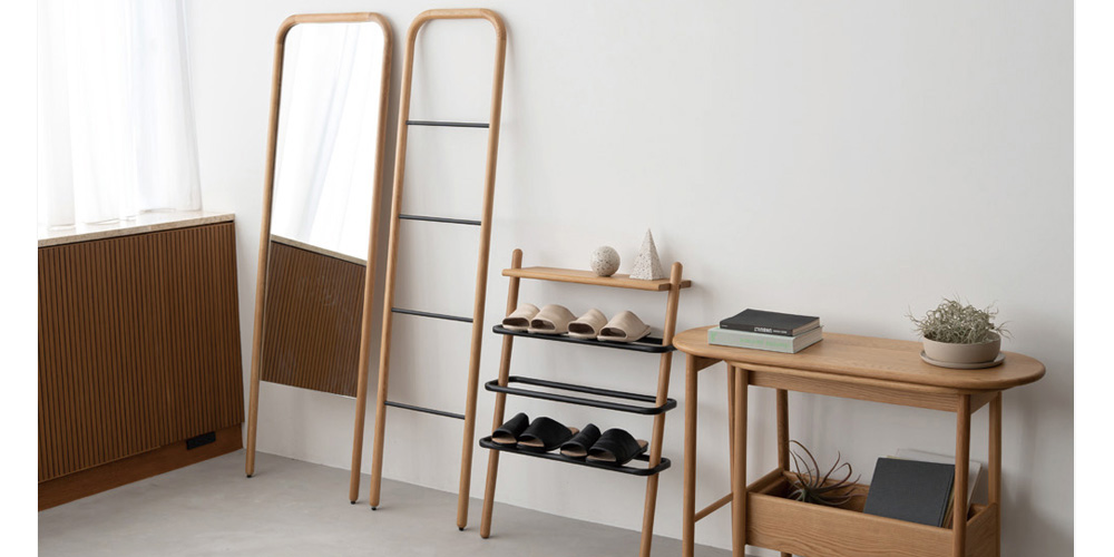 同シリーズにてラダーハンガー(左から二番目)、シューズラック(左から三番目)、コンソールテーブル(一番右)もあります。ラダーハンガーは木部カラーもサイズも同じなので、横に並べてコーディネートしてもGood。