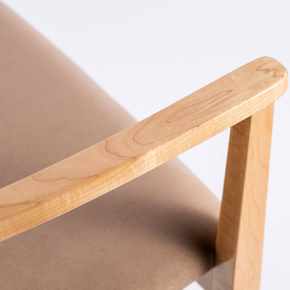 ハードメープルのやさしい木質感とやわらかな曲線が上品な印象を与えるフレームデザイン。手馴染みの良い、細身のアームになっています。