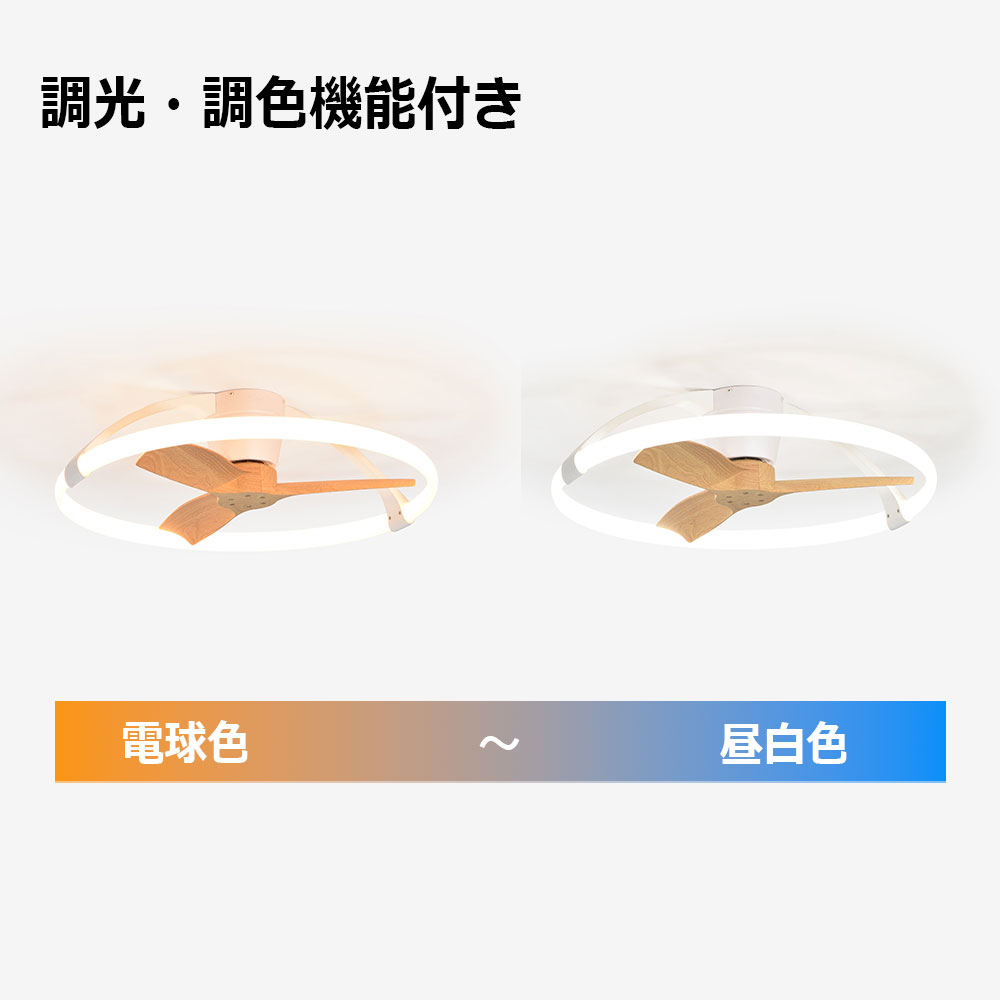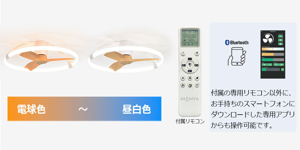 付属の専用リモコン以外に、お手持ちのスマートフォンにダウンロードしたアプリでも操作ができます。手軽に無段階調光(1〜100%)、調色(電球色〜昼白色)、ファンの回転スピード(Lv1〜Lv30)や回転方向も制御できます。