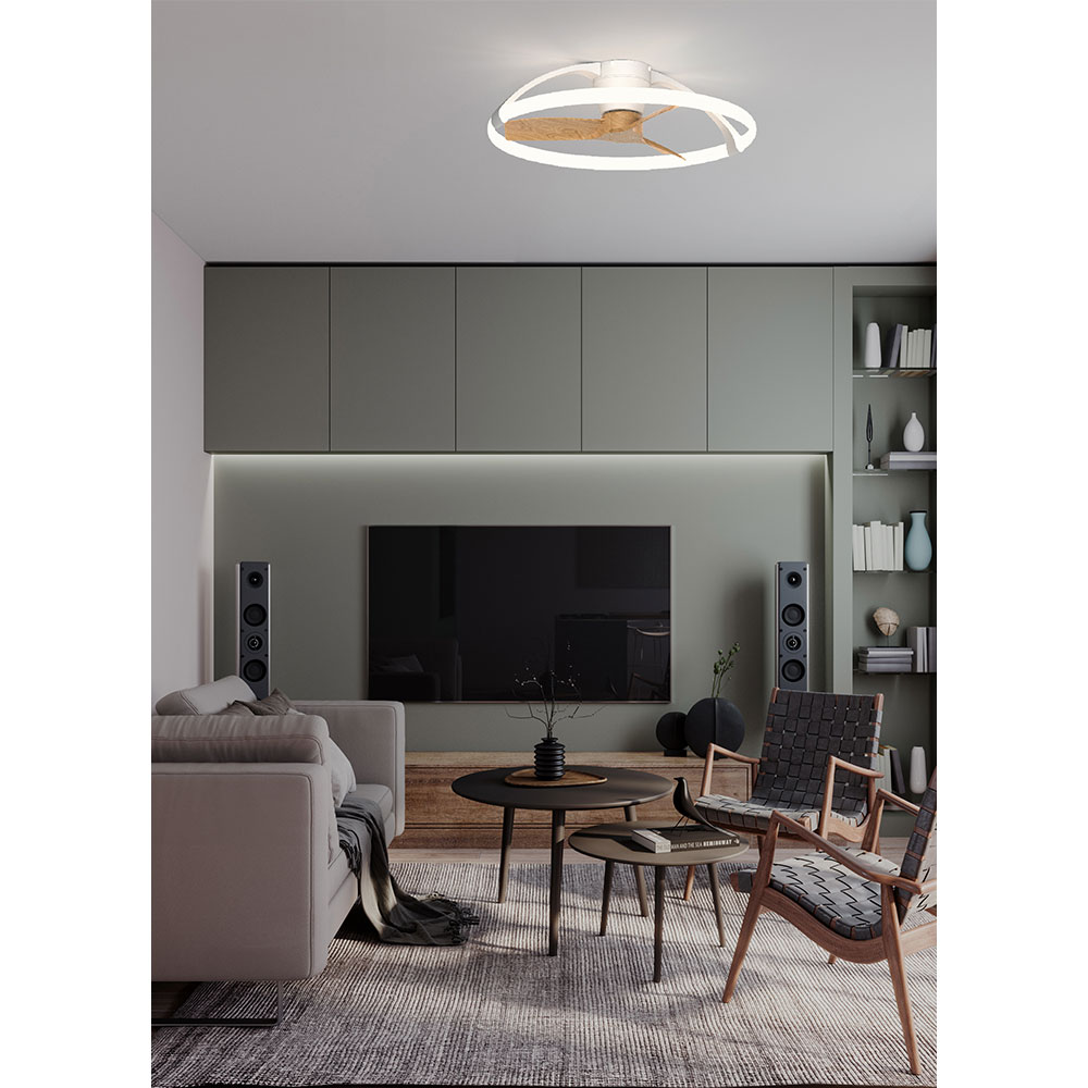「ミストラル」はミニマルなサークル状のLEDシーリングと3枚羽根のファンで構成された、まったく新しいデザインのシーリングファンです。器具高210mmの薄型で圧迫感が少なく、リビングダイニングの他、書斎や寝室といった今までファンを設置しづらかったお部屋にもおすすめです。