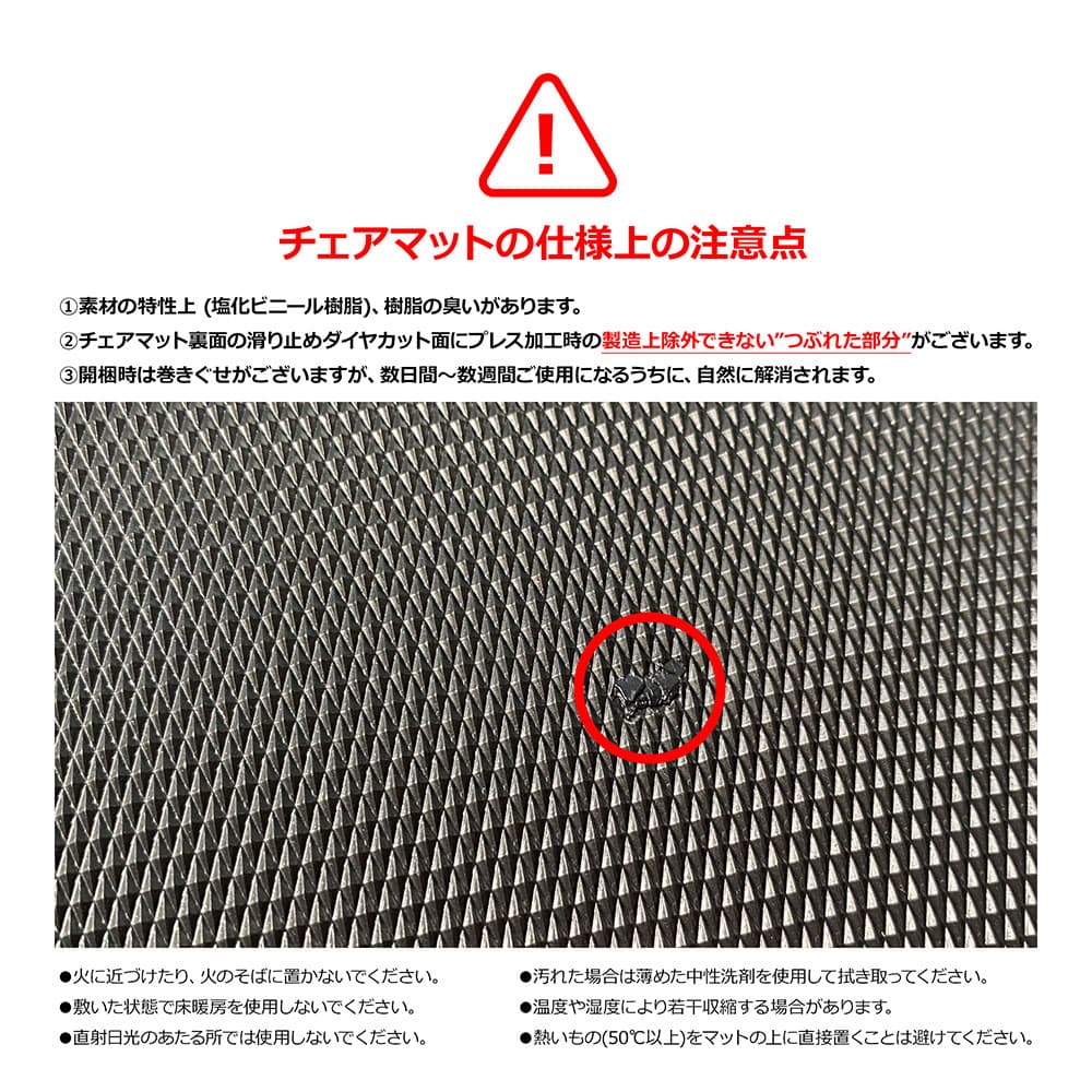 表面はキャスター滑りを安定させるシボ加工、裏面はダイヤカットのエンボス滑り止め加工を施したチェアマットです。デスクやPCに合わせてブラックとホワイトからお選びいただけます。
