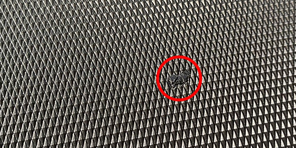 裏面の滑り止めダイヤカット面にプレス加工時の製造上除外できない「つぶれた部分」がございます。また、素材の特性上、樹脂の臭いがあります。
