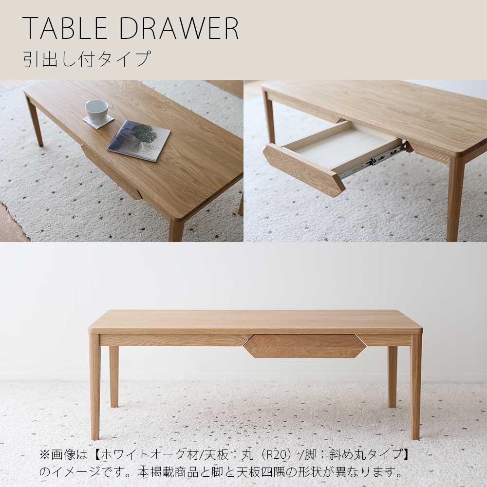 リビング周りの小物をしまうのに便利な、引出し付きのタイプもお選びいただけます。※画像は【天板:丸(R20)/脚:斜め丸タイプ】のイメージです。本掲載商品と天板四隅の形状が異なります。