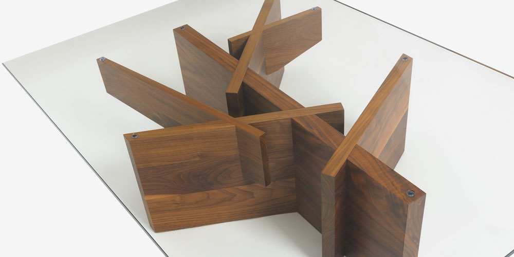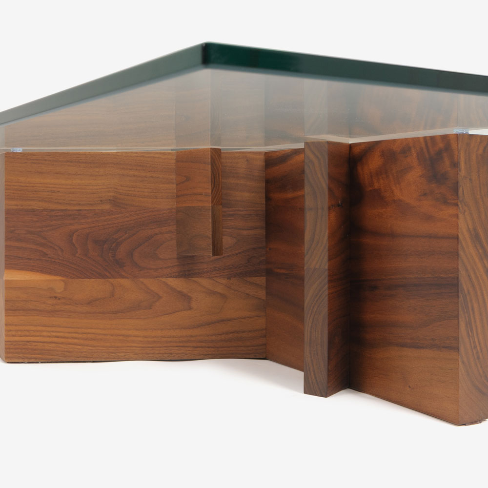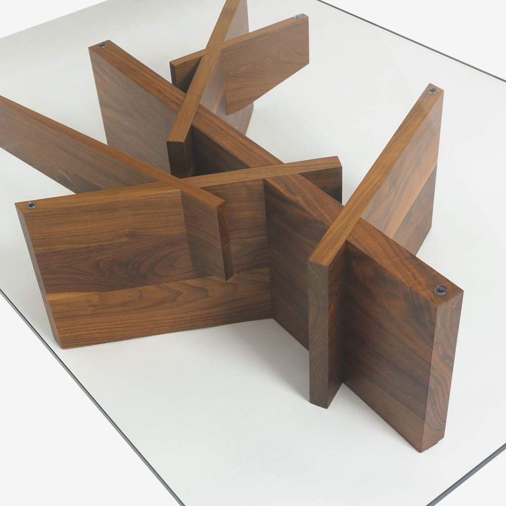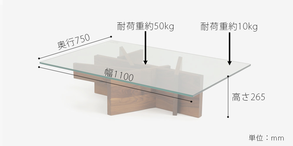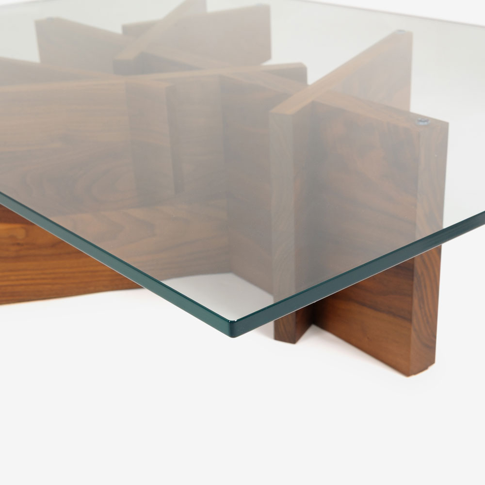 ベースはウォールナット無垢材を使用し、自然の木をモチーフにしたデザインが特徴です。透明なガラス天板からは、ウォールナットの流れるような美しい木目と、デザインされた脚がクリアに見え、空間に視覚的な広がりと明るさをもたらします。※天然木を使用しているため、木目・節・色味は1点ごとに異なります。