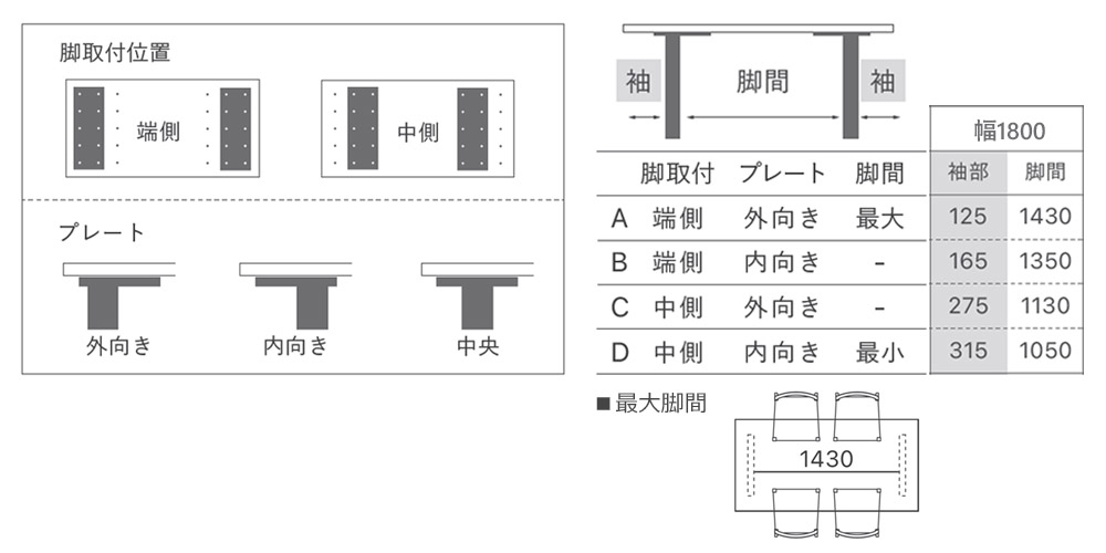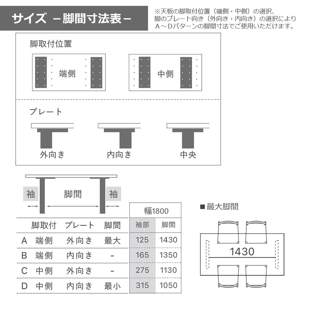 天板の脚取付位置(端側・中側)の選択、脚のプレート向き(外向き・内向き)の選択によりA〜Dパターンの脚間寸法でご使用いただけます。