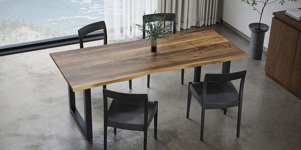 まるで一枚板のような自然の造形美を愉しめる、MASTERWALの記念すべき1stプロダクト「WILDWOOD」の耳付き天板タイプのダイニングテーブル。無垢の天板に異素材のスチールレッグを組み合わせたシンプルなデザインが、世界に一つだけの天板の有機的なフォルムを引き立てます。