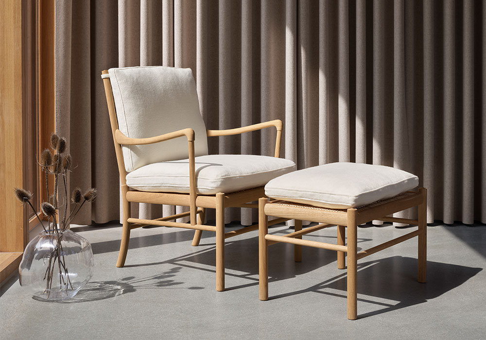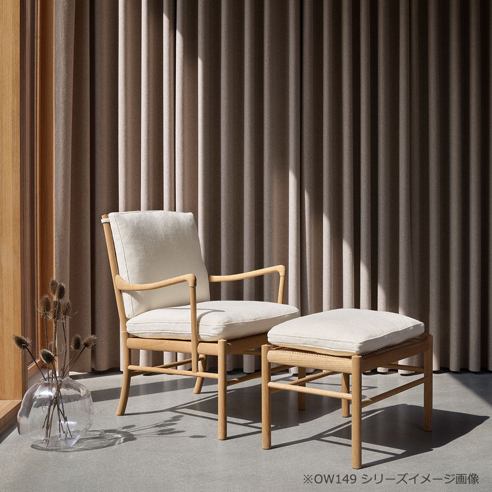 アームチェアOW149との組み合わせに最適で、ゆったりとしたくつろぎの時間を叶えます。※画像はシリーズのチェア+スツール使用イメージです。本ページ掲載品とは仕様が異なります。