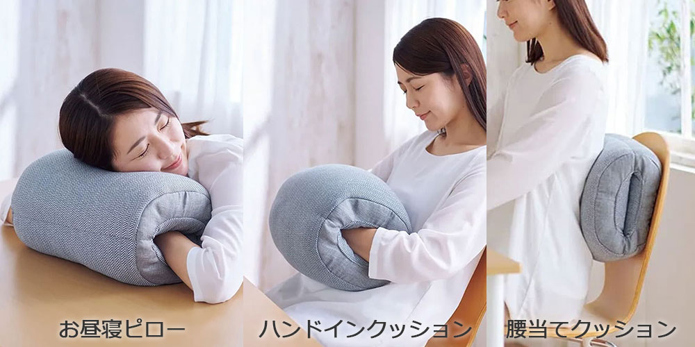 お昼寝ピロー、ハンドインクッション、腰当てクッションとして3wayでお使いいただけます。