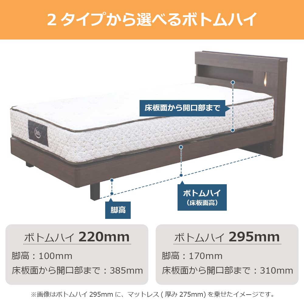 ボトムハイ(床板面高)はマットレスの厚みやお掃除ロボットの使用に合わせて、220mmタイプと295mmタイプからお選びいただけます。※画像はボトムハイ295mmに、マットレス(厚み275mm)を乗せたイメージです。