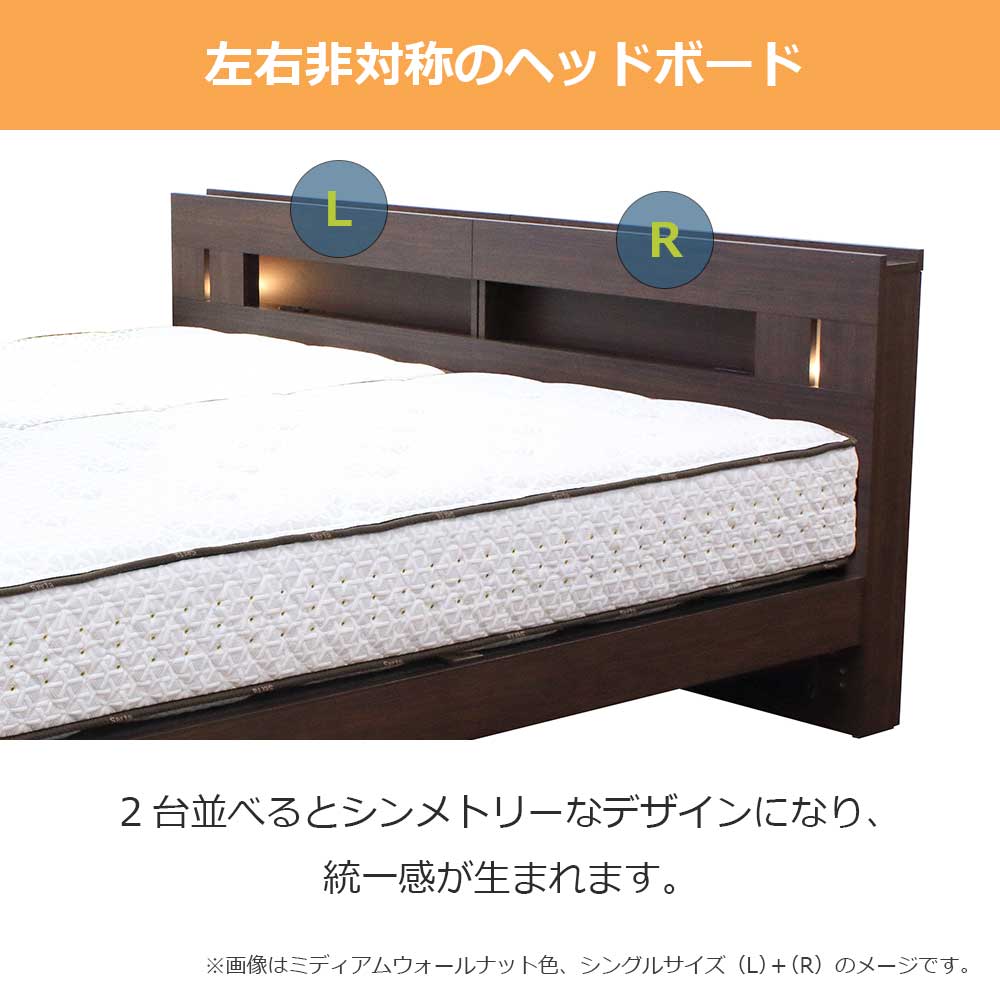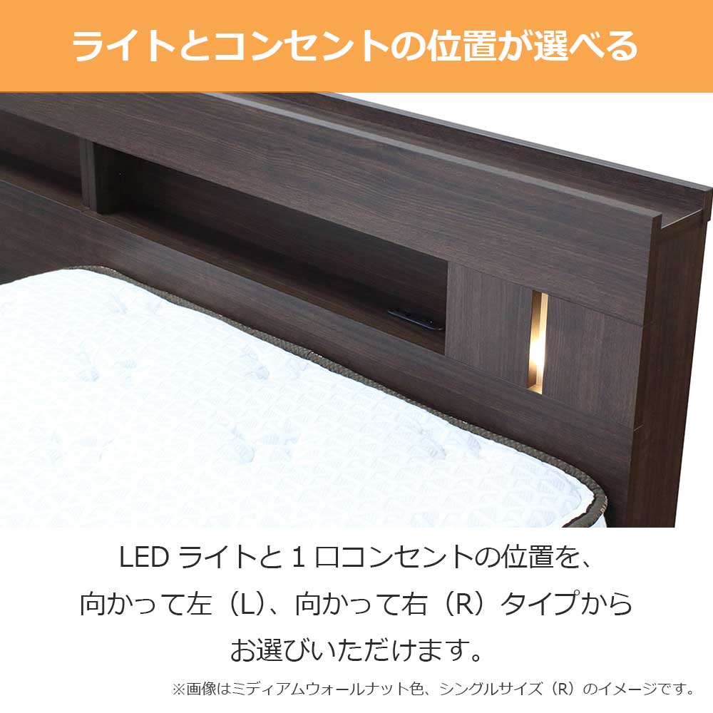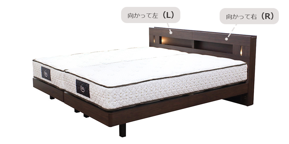 LEDライトと1口コンセントの位置を、向かって左(L)、向かって右(R)タイプからお選びいただけます。※画像はシングルサイズ向かって左(L)+シングルサイズ向かって右(R)のイメージです。