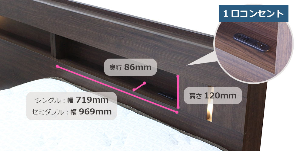 ヘッドボードには目覚まし時計や眼鏡、スマートフォンなどを置くのに便利な奥行86mmのスペースがあります。LEDライトと1口コンセントも完備しているので、スマートフォンの充電にも困りません。使いやすさを追求した、機能的なデザインです。