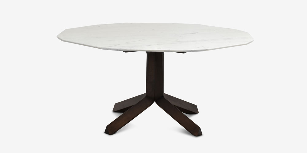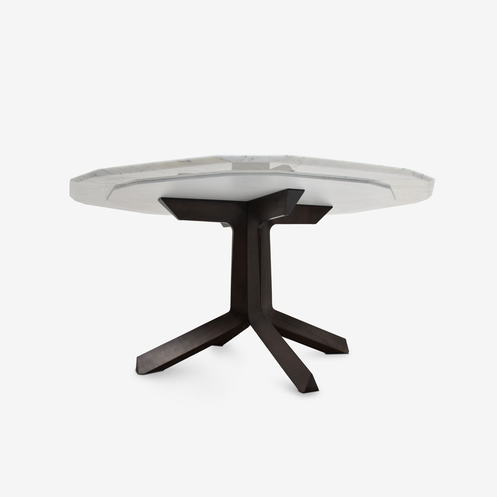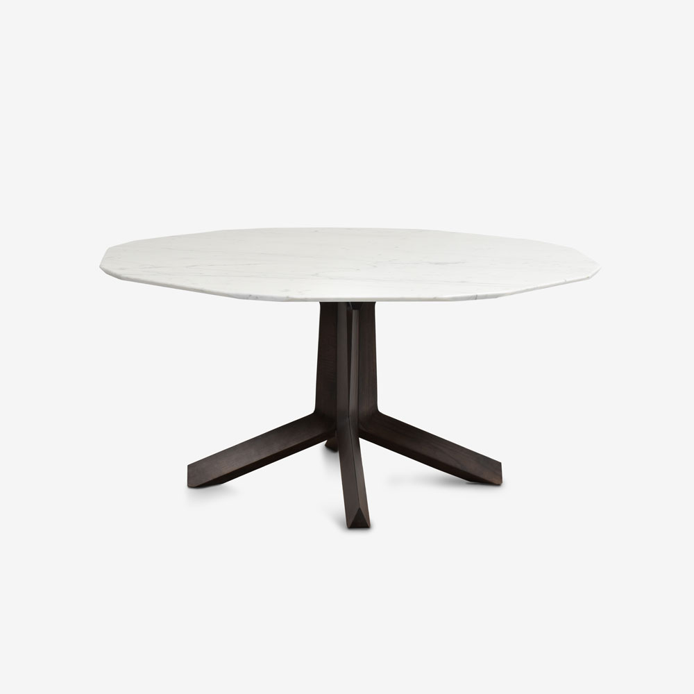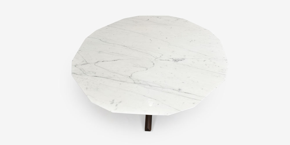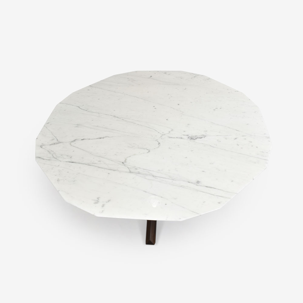 三角形の木脚と多角形の大理石天板が織りなす、洗練されたデザインのダイニングテーブルです。デザイナーのロベルト・ラッツェローニは、1950年代から1960年代のイタリアデザインが持つ厳格な美意識を現代に蘇らせました。シンプルで上質な素材を厳選し、流行に左右されないタイムレスな価値を持つこのテーブルは、どんな空間にも上品な趣を添えてくれます。
