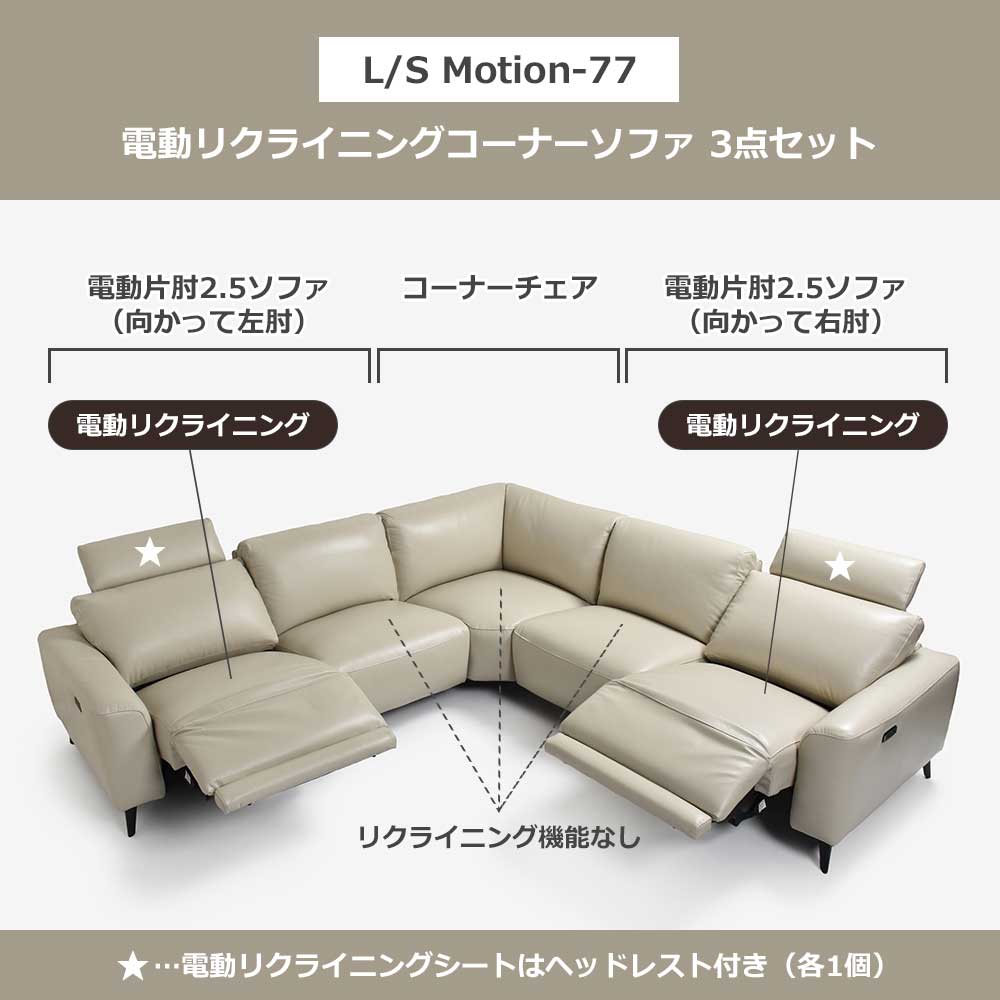 電動リクライニングコーナーソファ3点セット「L/S Motion 77(エルエスモーション77)」幅275cm 革#J/S-041E オイスターグレー色