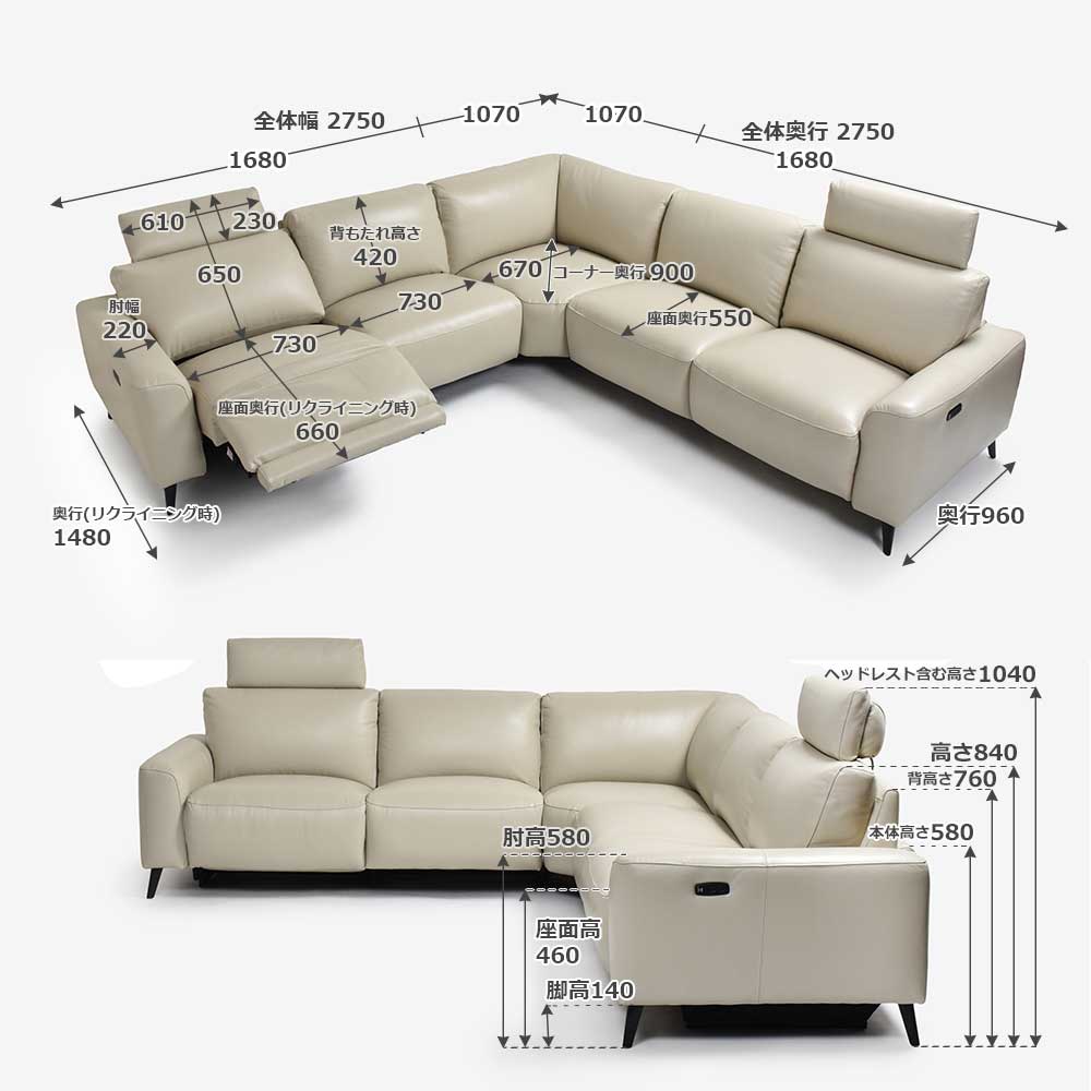 | 電動片肘2.5ソファ(向かって左肘/右肘) | 幅1680x奥行960〜1480x高さ840〜1040 |