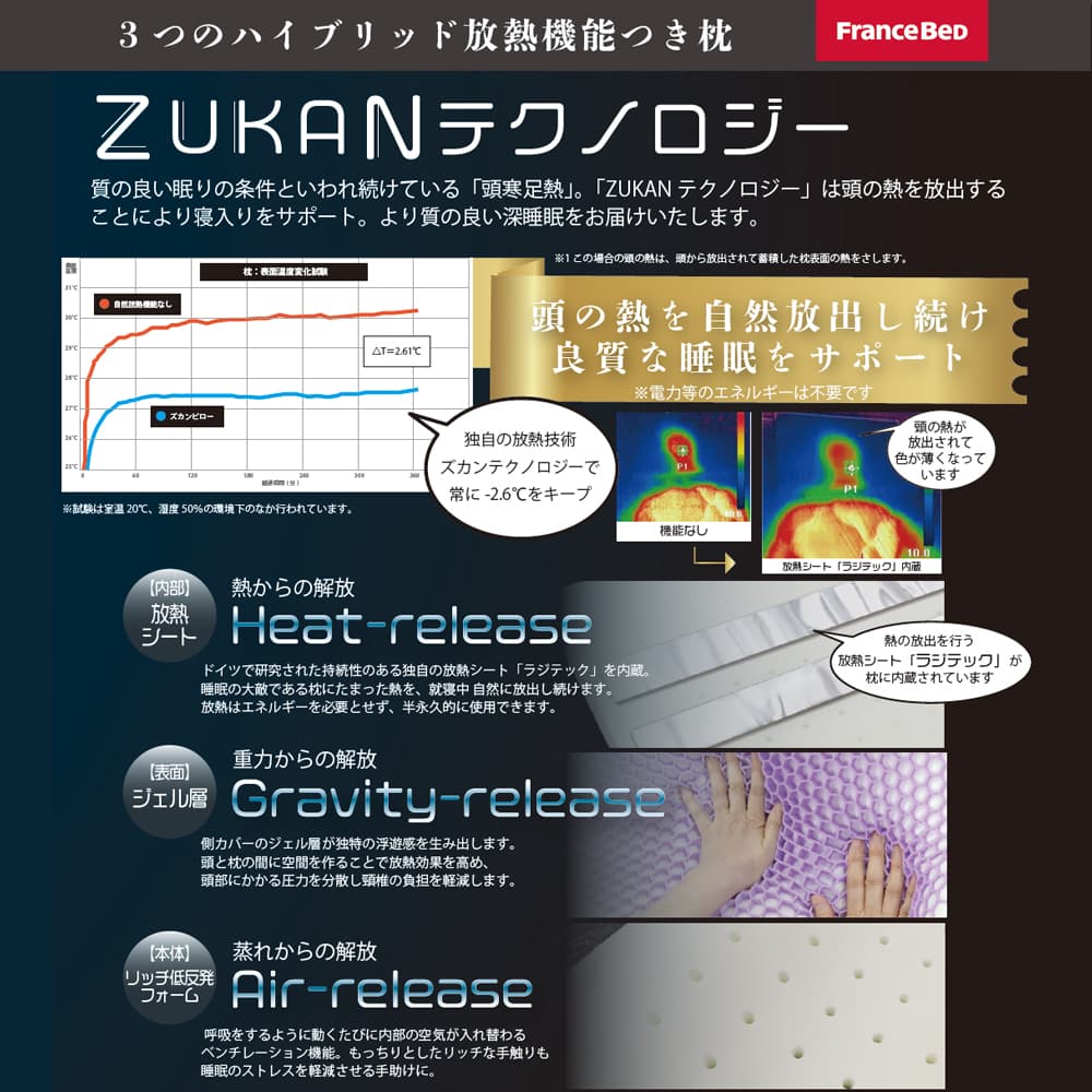 質の良い眠りの条件と言われている「頭寒足熱(ずかんそくねつ)」。ズカンピローは、独自の放熱テクノロジーにより、一般的な枕と比べて表面温度を 2.6℃低く保つ涼感タイプの枕です。内部に採用されている「放熱シート」が、枕に溜まった熱を就寝中に放熱し、枕のムレを軽減します。