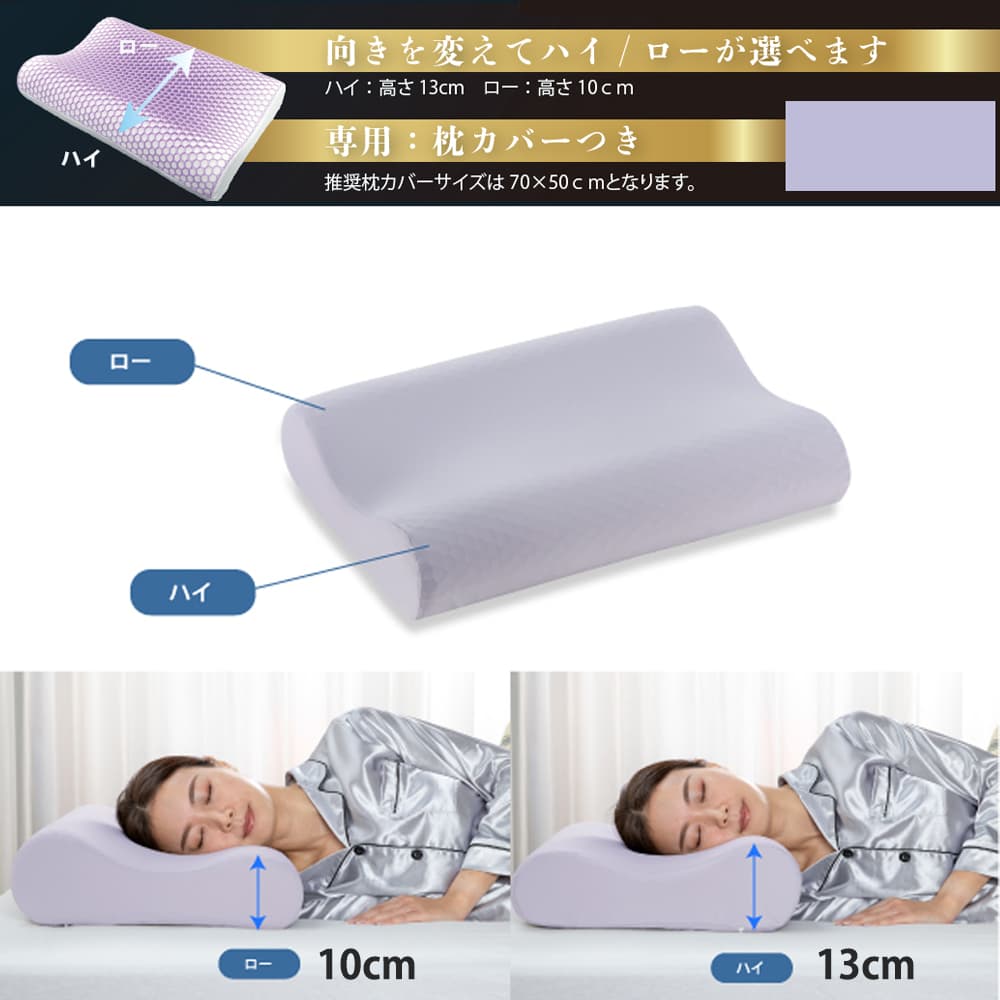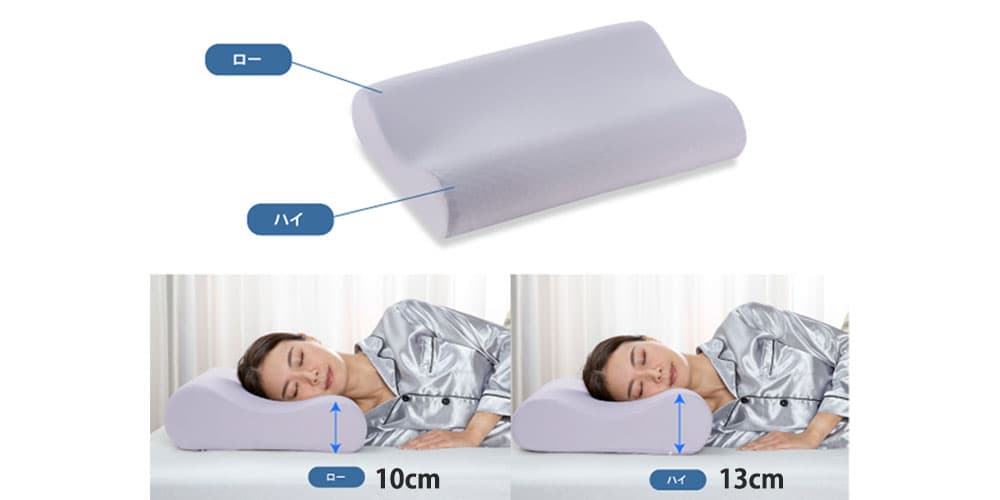 枕の向きでロー(高さ10cm)・ハイ(高さ13cm)の高さ変えることができ、お好みの高さでお休みいただけます。