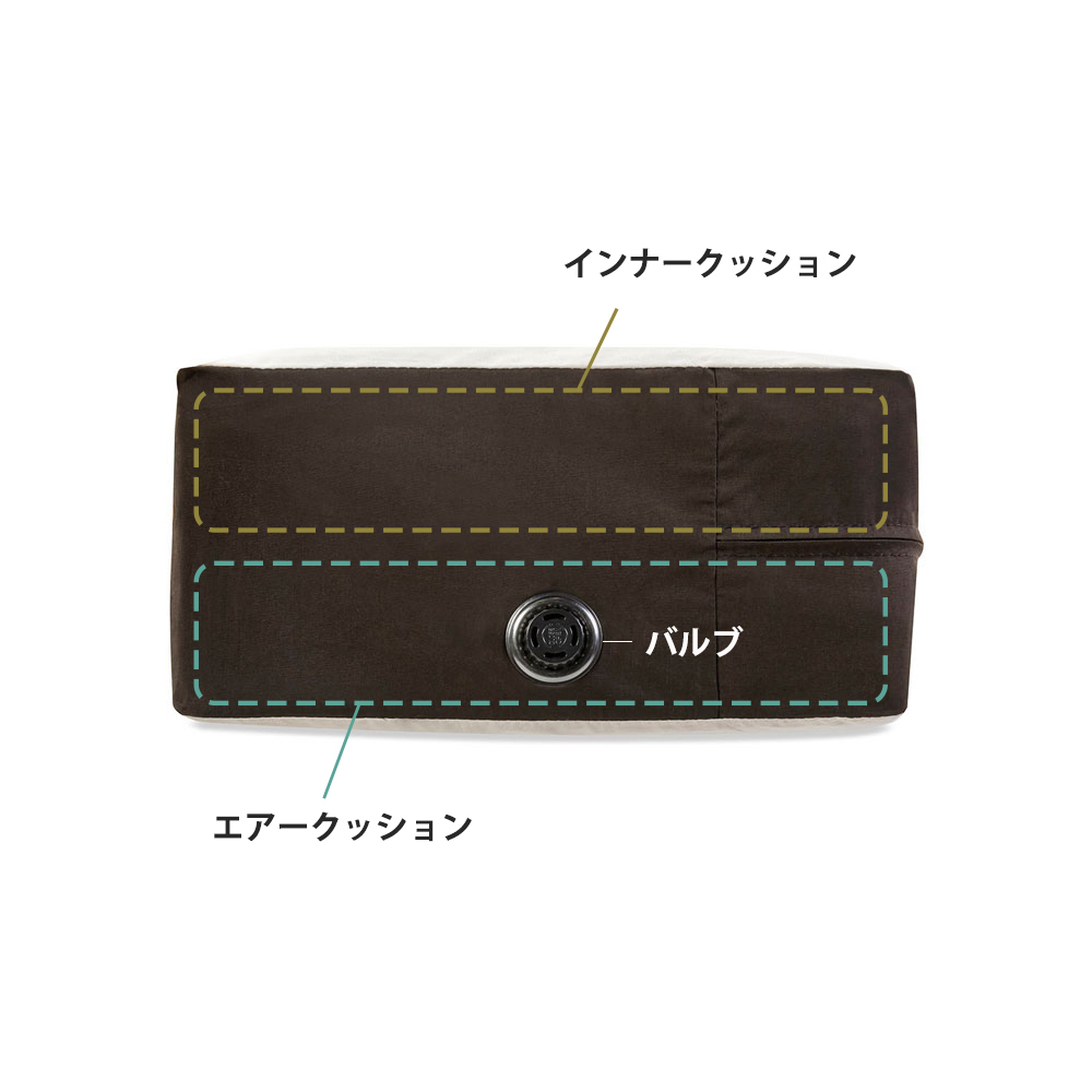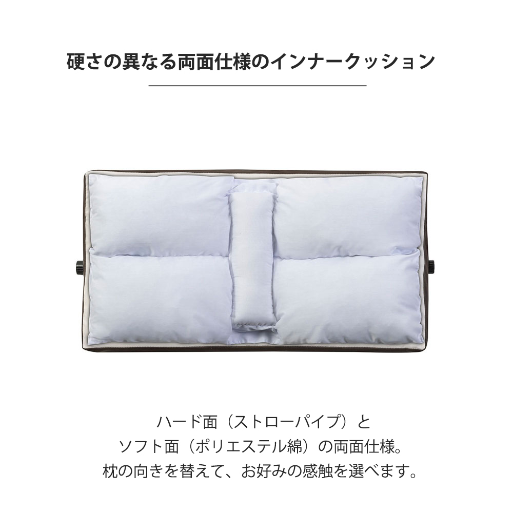 インナークッションはハード面(ストローパイプ)とソフト面(ポリエステル綿)の両面仕様。枕の向きを替えて、お好みの感触をお選びいただけます。※画像は内部イメージです。