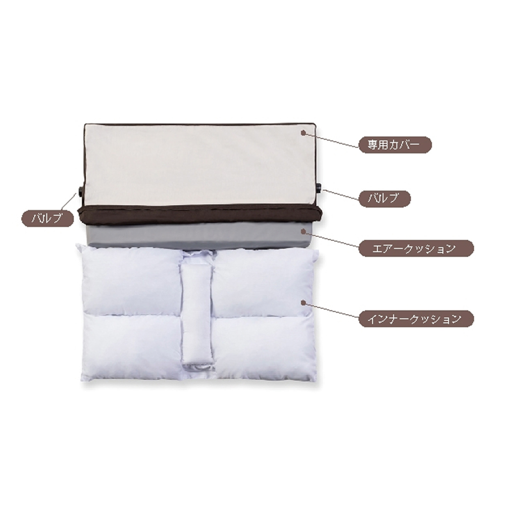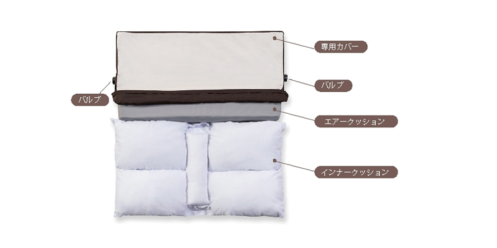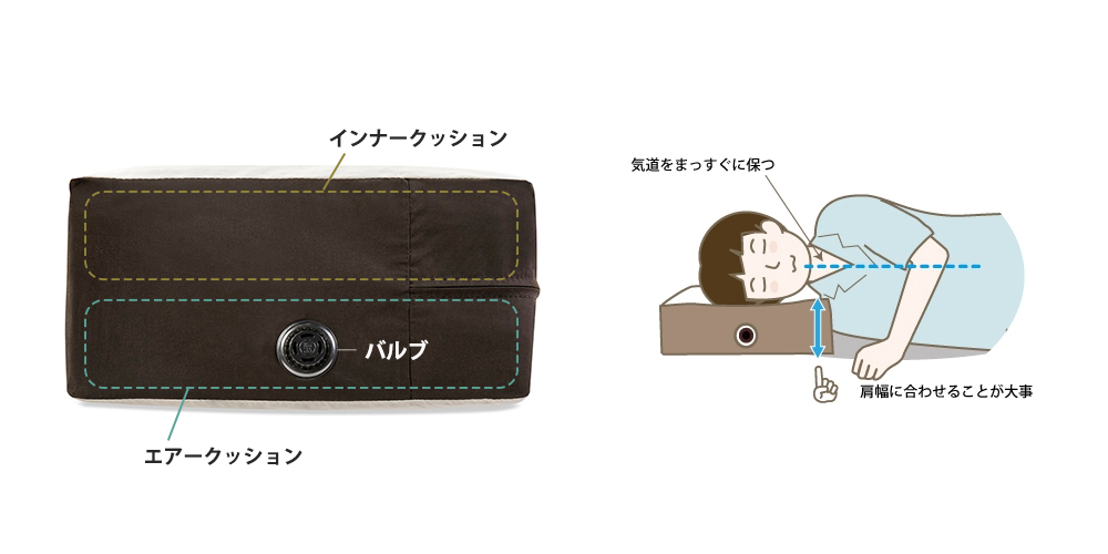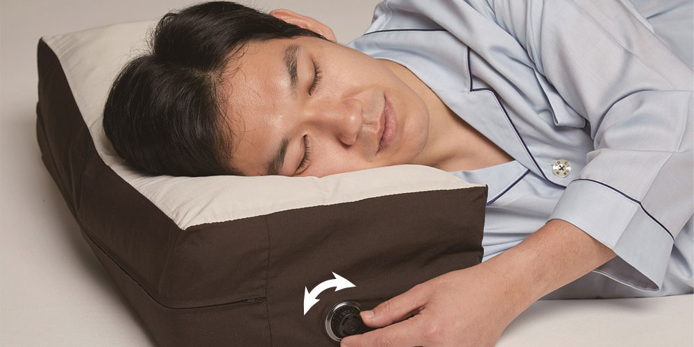 サイレントナイトピローは寝たままバルブのつまみを回すだけで、内部のエアーを調節でき、お好みの高さにフィットさせることができます。