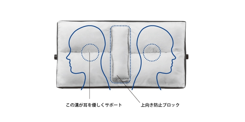 中心には上向き防止ブロックがセットされており、寝返りのときに上を向いてしまうのを防ぎます。また、クッションの中程に溝があることで、長時間の横向きで耳が痛くならないようやさしくサポートしてくれます。