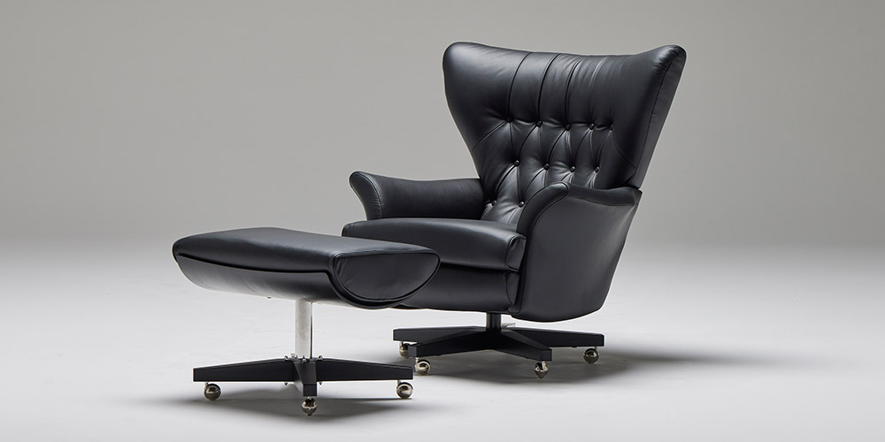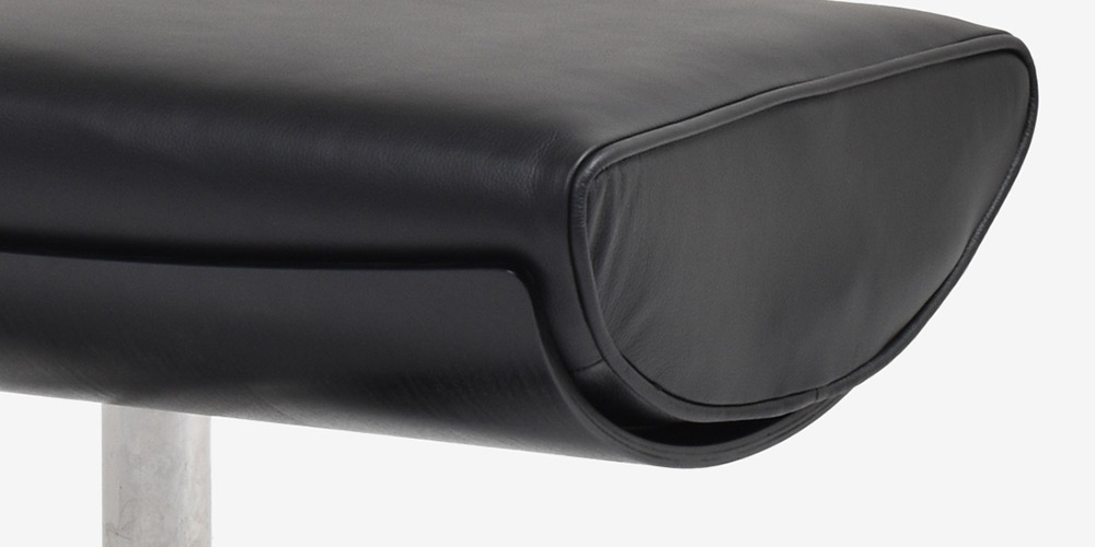 座面は積層合板により丸みをもたせたデザインのウッドフレームに、張りのある総革張りのクッションで構成されています。