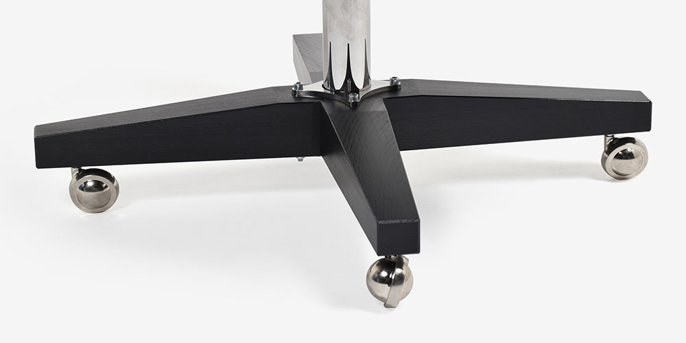 ブラックカラーの木製脚にメタリックなスチール製のキャスターが対照的で目を引きます。キャスター付きでスムーズに動かすことが可能です。