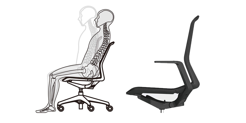 リクライニング反力を適切に設定し、可能な限り調整機能をそぎ落としたシンプル機構を実現しました。弓のようなラインを描く背座一体シェルは、骨盤は立ち、背骨がS字ラインになるようにデザインされており、正しい姿勢をサポートします。リクライニング時に太腿などが圧迫されにくく、幅広いユーザーの体の動きに自然に追従します。