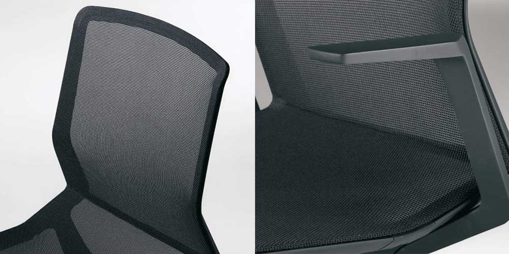 張地は通気性の良いメッシュ仕様です。2つの異なる糸を編み込むことで、透け感がありながらも風合いのあるメッシュを実現しました。アームは見た目も美しいシンプルなデザインアームを採用しています。