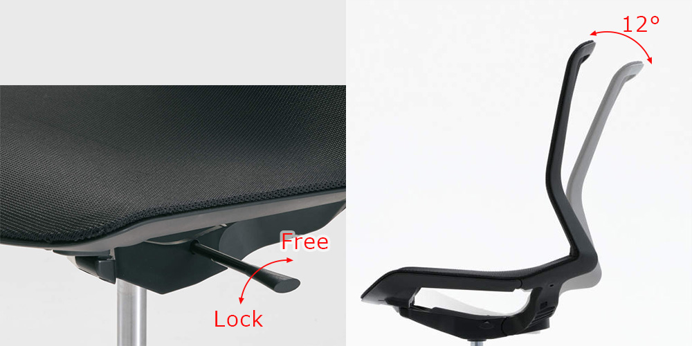 背もたれによりかかると背が後方に12度倒れます。座面左下のレバーをひねることで背もたれを初期位置で固定することが可能です。